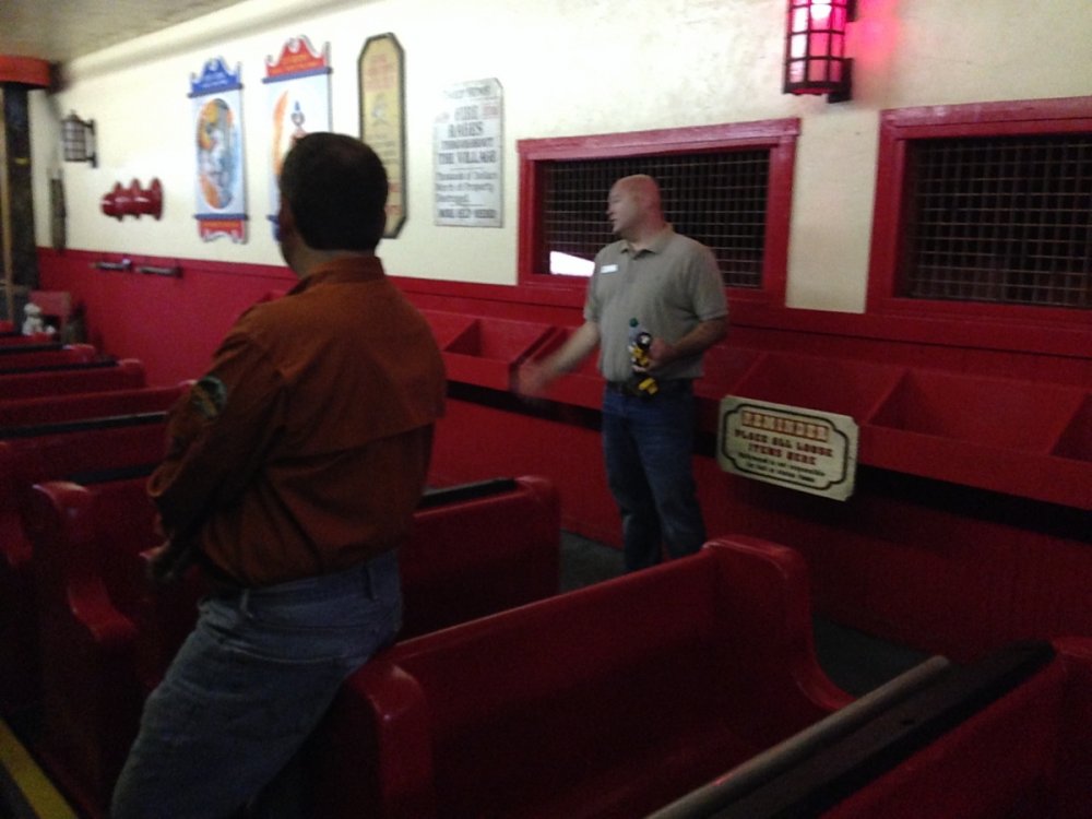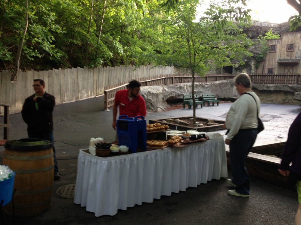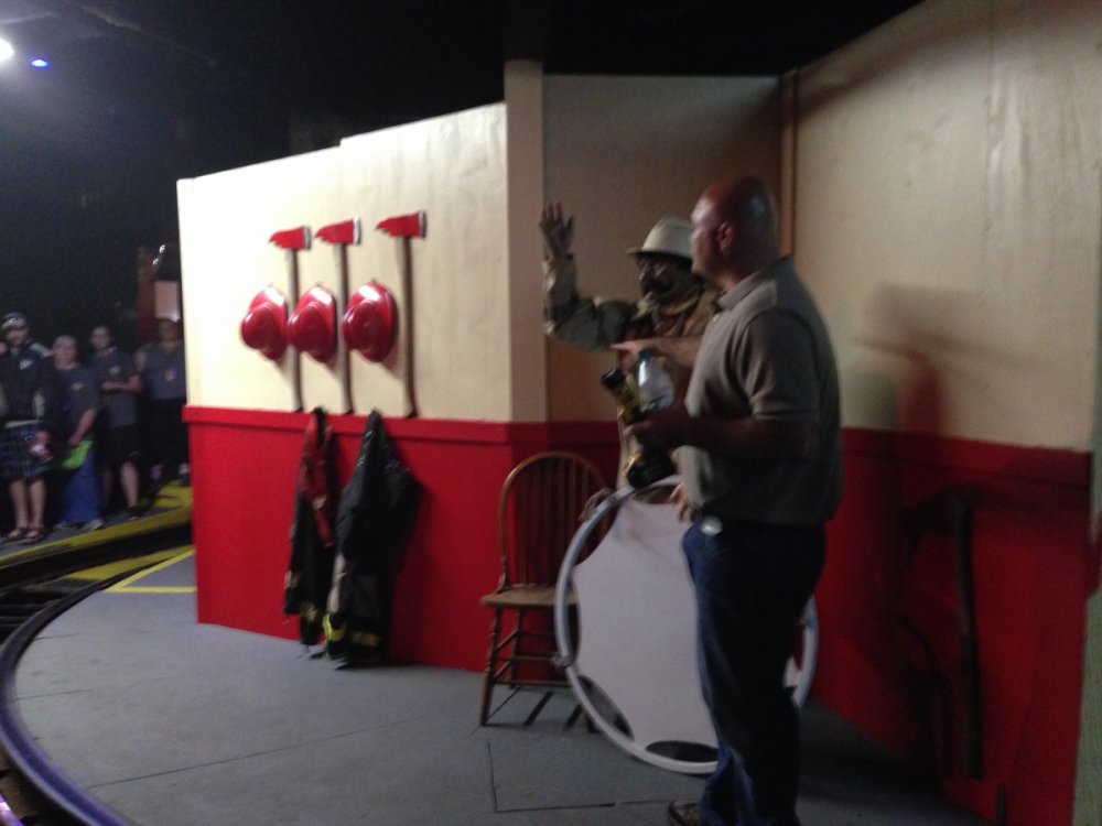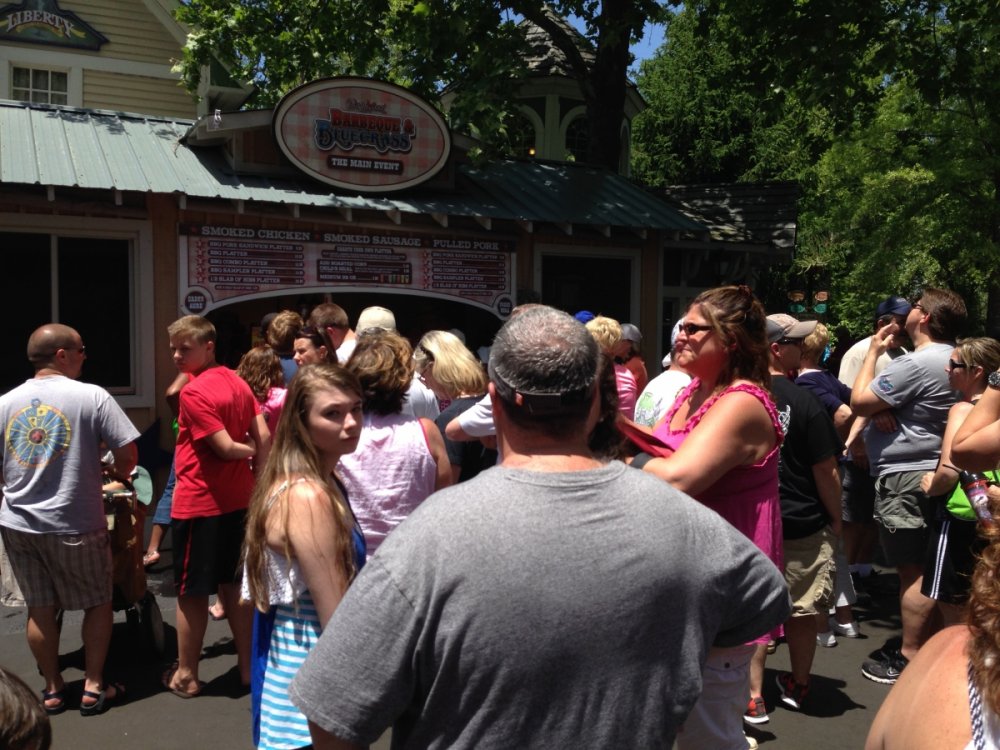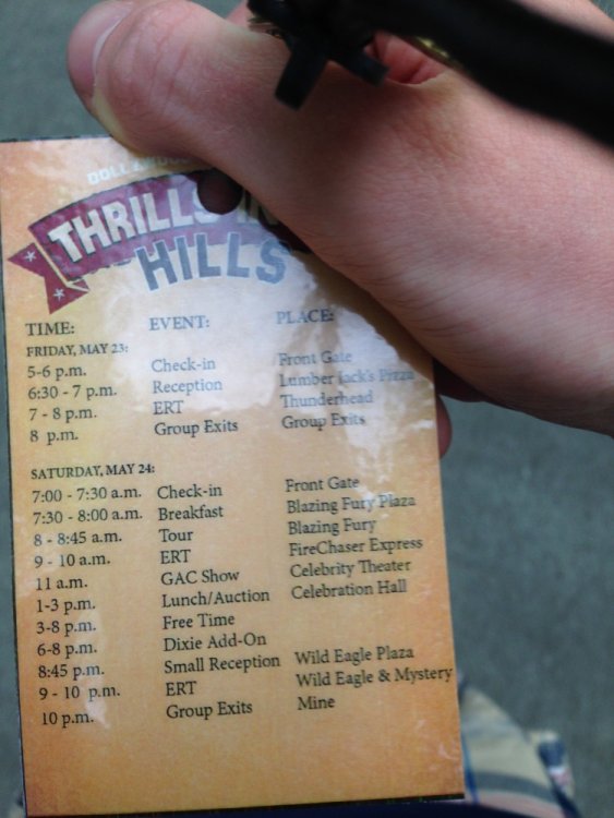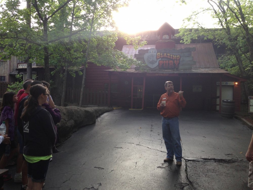 Day two was amazing, it started off with a walkback tour of Blazing Fury where Pete and the maintenance guy gave us a really good tour. Then we had ERT on FireChaser Express, which ran really well. We had prefered seating at the GAC show, which was really good (better than A Christmas Carol). Then we had a wonderful lunch and to top off the day we saw Vince Gill and the Timejumpers! Now onto the photos... (sorry about the photo quality) We arrived early in the morning to an empty park They were already staring to cook corn and pork for the day. We got breakfast before the Blazing fury tour (muffins and yogurt) Pete Owens was there to give us a tour (it was funny he was wearing an Adventure Mountain shirt) The maintenance guy was also out tour guide. The trains were painted red this season New fireman at the start of the ride Frog Alley New reference in the ride The tavern scene, they updated the fire effects this year to LED lights that were supposed to be used for a water effect New fire effects in the upper window The gun fighter doesn't move any more, also they updated some of the characters in the ride so they were not as bulky Frog Alley reference Graveyard scene Molly is seated now and the updated fire effects in the windows DP...Do I know someone with the initials DP... New horse in the stable New water effect There is some great themeing on this ride!!! Showing the deteriorating cave of the ride Those are some big ants New bear The burning bridge scene Backstage catwalks The Maintenance shop The Maintenance shop NOTED! New Laser effect instead of the water Magnetic breaks. Apparently, if you lay a wrench on one, it takes two people to get it off. ERT on FireChaser Express was amazing. I got to ride in each row of the train, I can say the front and the back give the best rides. We got preferred seating for the GAC show. Had to ride the Slidewinder And they're off!! This doesn't need a caption. Lunch was a BBQ Buffet Yummy BBQ and Bluegrass had just started People really wanted their BBQ Got stuck by the train... Howdy! Saw Vince Gill and the Timejumpers!