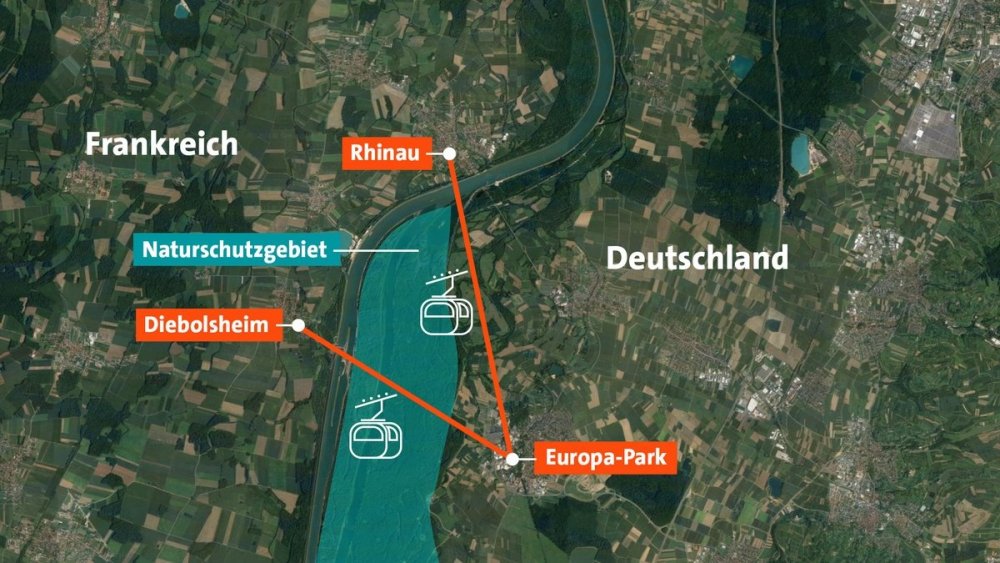 Europa Park plans to build 6km cable car from the park to... FRANCE Europa Park has held a press conference to give details about 'Project S', a new cable car system that they are planning. If built, it will travel over the river Rhine, crossing the France-Germany border to either Rhinau or Diebolsheim in Alsace. The journey by cable car will be approximately 15 minutes. Currently over a million visitors to Europa Park are French, and 1500 employees commute from France every day. On the French side it is planned that there will be a holiday village similar in style to Centre Parcs with accommodation in wooden cabins and car parking. French president Emmanuel Macron has given his support for the project which has a timescale of around five years assuming plans are approved. One large hurdle to overcome is that the preferred route will cross Taubergießen, a large nature reserve near the River Rhine. Obviously a cable car is probably the least-destructive mass transit system that could be built, but there could still be objections. More information: SWR News: Cable car to cross the Rhine and the border (in German) EP Fans: Press conference live stream (in German) Project S. Image: EP Fans Press Conference. Image: EP Fans Preferred route (bottom), alternative route (top). Image: SWR News Michael and Roland Mack (2nd and 3rd left) with Emmanuel Macron (French President, 4th from the left) with various French representatives. Image: SWR News There hasn't been an official press release, but the park's press office announced the cable car and the press conference on Twitter: "A dream was born: A Franco-German project will hopefully bring both countries closer by a cable car. The investment in France will create new jobs." Emmanuel Macron, the French President, has given his backing to the project on Twitter: "Europa-Park has chosen to invest in France. It's the consecration of a true Franco-German project that will create thousands of jobs" -