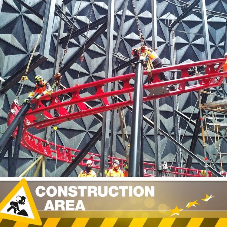 New new Can Can picture courtesy of EP's Facebook page. There's red track in the foreground, and grey/black track towards the top of the picture which looks like original track to me, not sure. Perhaps the red track will all be towards the bottom of the ride and there will be scenic elements and it will be lighter (which is why the track is coloured). -