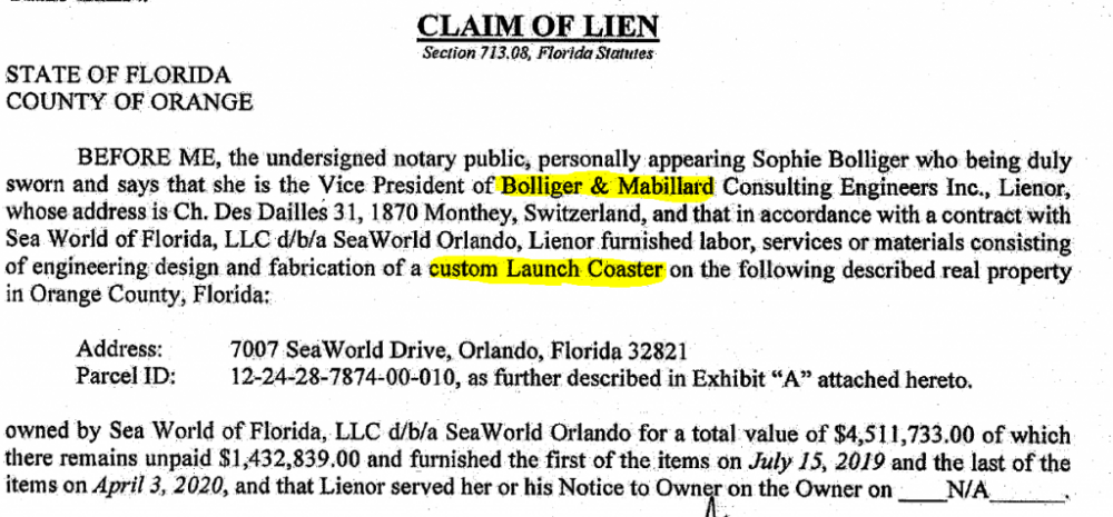Behind the Thrills has posted what appears to be a lien filed against Seaworld by Bolliger & Mabillard which seems to endorse the theory that a Surf Coaster is on its way at some point: So far we know B&M have trademarked the name 'Surf Coaster' and that Seaworld Orlando received a shipment of parts labelled 'SF-A' (Surf Coaster 1). So far enthusiasts have been speculating on this being a new stand up coaster (and there was a pretty bad fake 'blueprint' circulating around), but I've always backed the idea that it could be B&M's take on the Blitz Coaster, and the lien mentions that this is a launched coaster. All these little clues seem to be giving credibility to the idea that we'll be seeing a new B&M product soon, although coronavirus could have the final word I suppose.