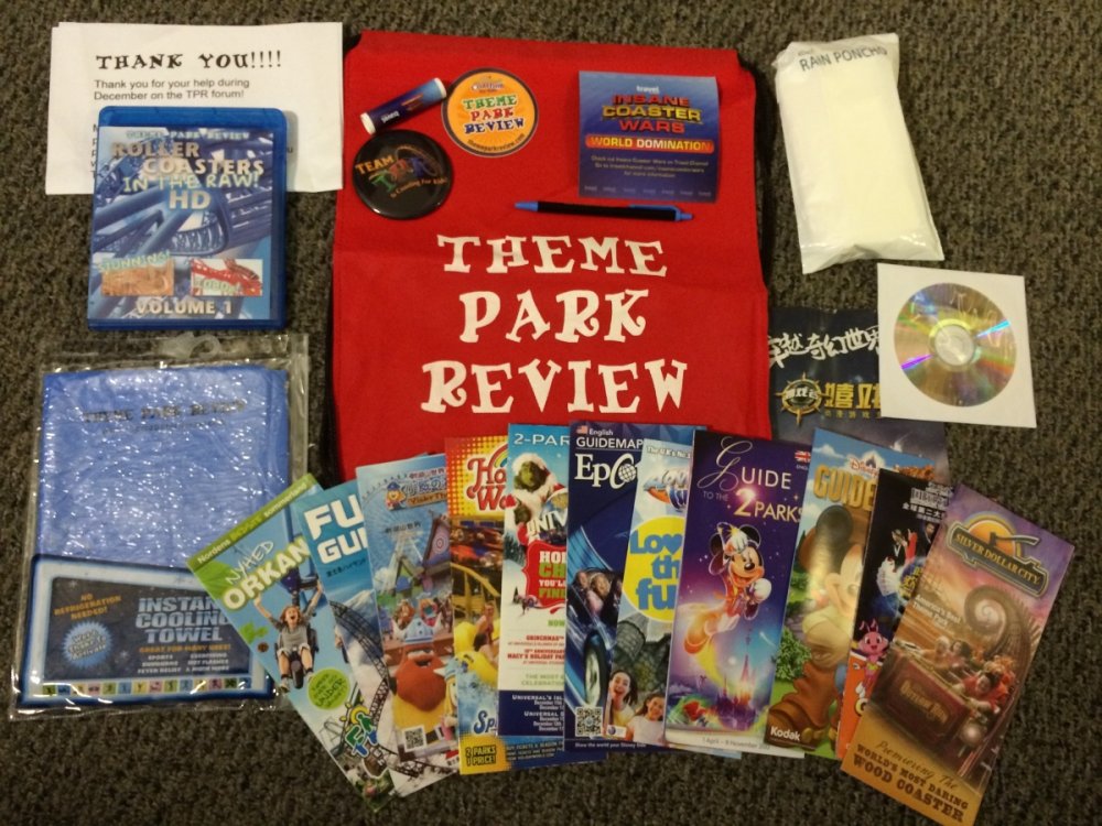 Got a Bag-O-Crap Today!!!!! Contents: TPR Backpack Insane Coaster Wars World Domination magnet and chap stick Team TPR Coasting For Kids button and sticker Roller Coasters in the Raw HD Volume 1 TPR pen TPR instant cooling towel 12 park maps TPR rain poncho Mystery DVD Thank You letter from Robb -Thank you Robb and Elissa for everything you do for this amazing website/community. -