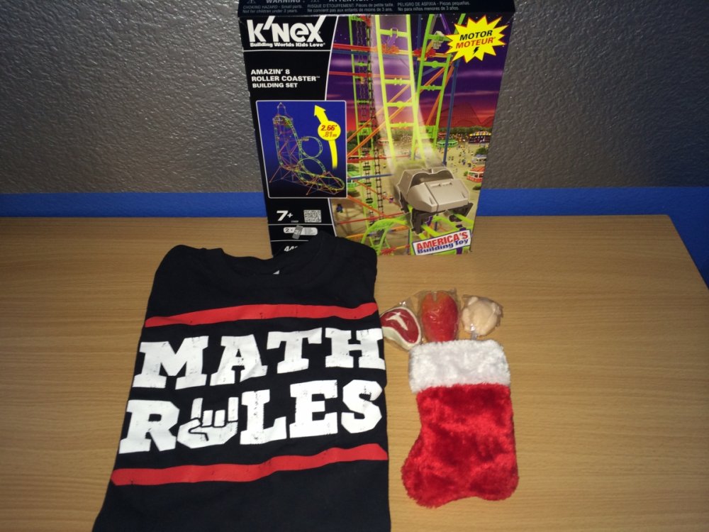 I opened my gift and I loved it! Thank you such much! Of course I already put it together and then messed around with different layouts A K'nex coaster, a "Math Rules" T-shirt, and steak,claw,and chicken shaped lollipops.