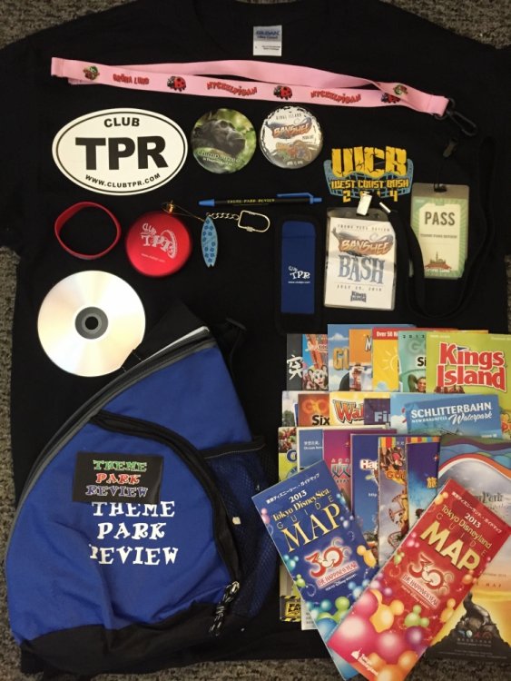 Received my Bag-O-Crap today! Thank you so much Robb and Elissa, you are amazing. Contents: TPR Bag TPR magnet TPR pen Club TPR Ornament Club TPR magnet Club TPR luggage identifier Banshee Bash lanyard Grona Lund lanyard Geauga Lake bottle opener Nigloland bracelet Chimpanzee pin Banshee Media Day pin Knotts WCB 2014 Shirt Mystery DVD Large quantity of park maps! So much Crap! All of the maps! (I am especially excited by the Tokyo Disney ones) -