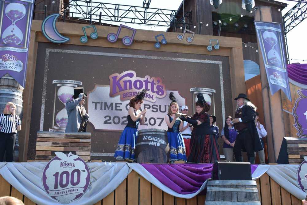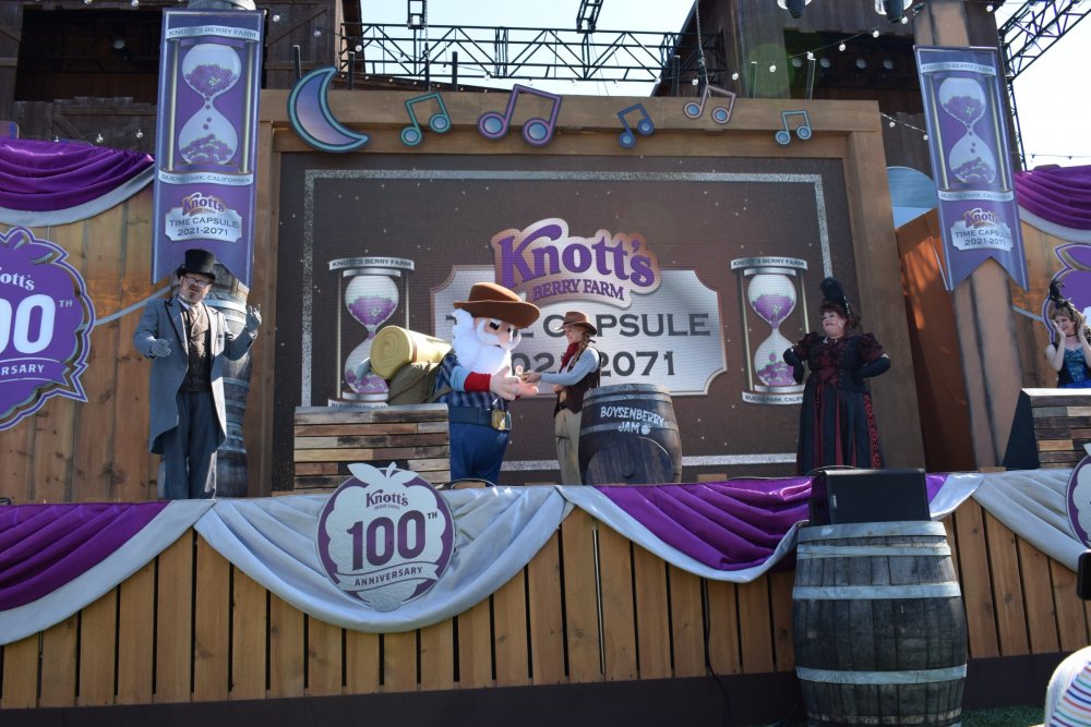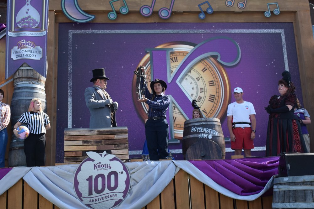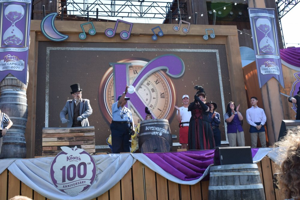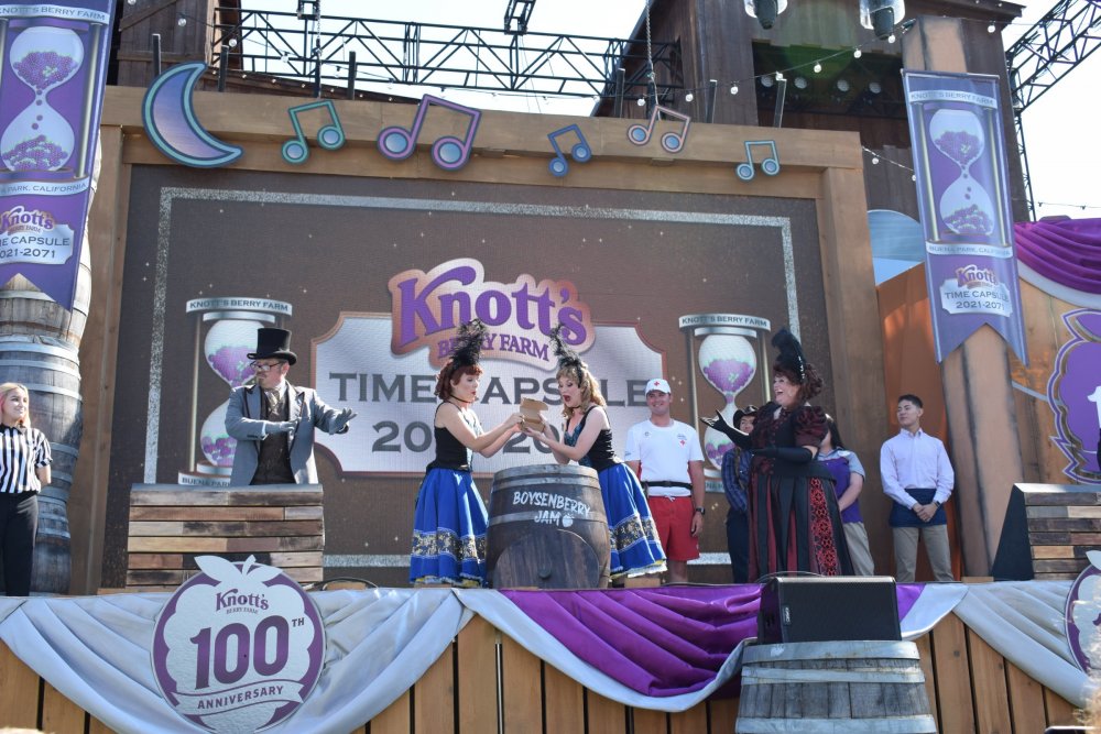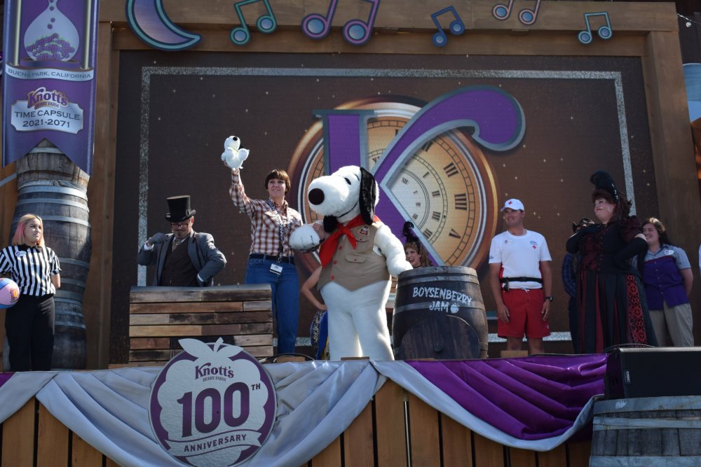 6. As part of the 100th year anniversary, Knott's is burying a time capsule! Theme Park Review was invited to the park to see the festivities. Deputy Mayor Milton C. Howell and Ms. Cameo Kate presided over the show. The Time Capsule is scheduled to be opened in 50 years on June 30, 2071. Items were placed into a large boysenberry jam barrel. First, Whittles came out and put the first item into the barrel, a golden nugget. Next, Knott's associates were led on stage by Snoopy. One by one, they each placed an item(s) into the barrel. Finally, a picture of everyone watching the ceremony was taken that will be placed in the capsule as well. The capsule is going to be buried in front of the new ride, Bear-y Tales: Return to the Fair. We received a nice booklet with a timeline of Knott's 100 year history. Whittles brought a gold nugget. Banner with employee signatures. A tube from Soak City. Mrs. Knott's Chicken Dinner menu and pie pan. Seeds and a jar of dirt from Knott's berry vines. The girls took off their garter belts and put them in the time capsule. A harness from the Stage Coach. Snoopy put a Snoopy plush into the barrel. A piece of wood from Ghostrider. A box of screws from Ghostrider. A bottle of disinfectant and box of gloves. A roll of toilet paper. Kids from The Boys and Girls club of Buena Park. Sealed and ready to be buried.