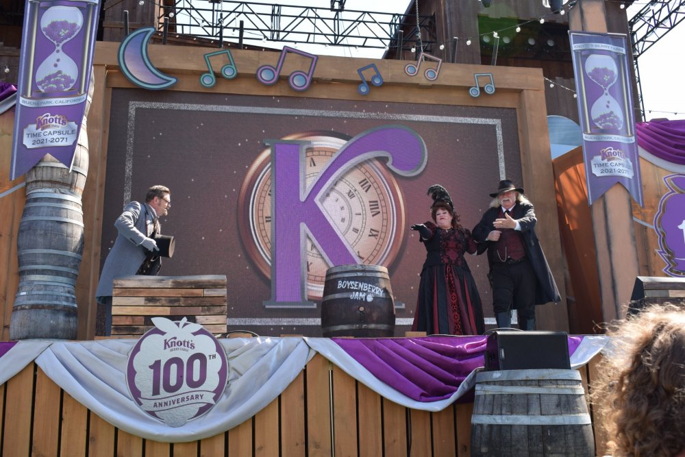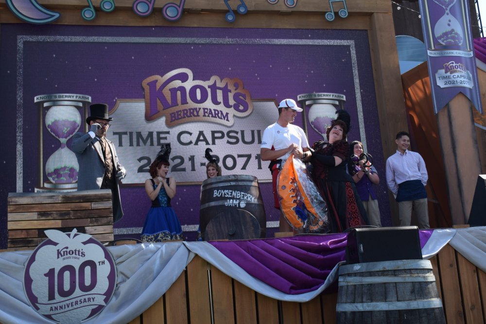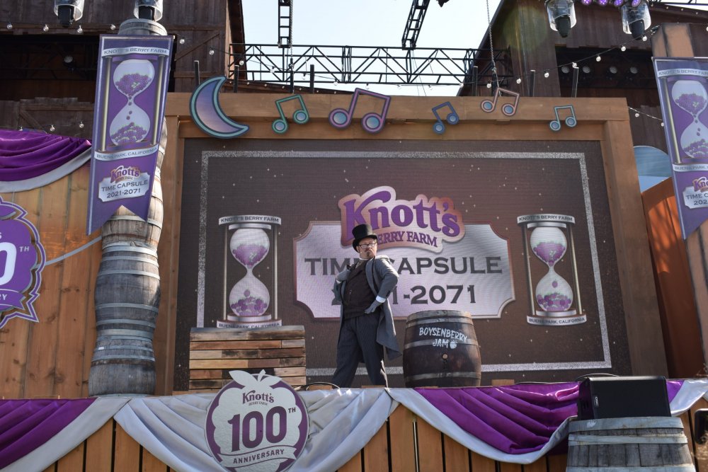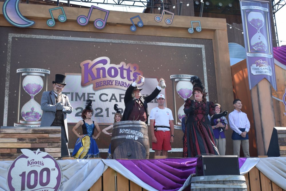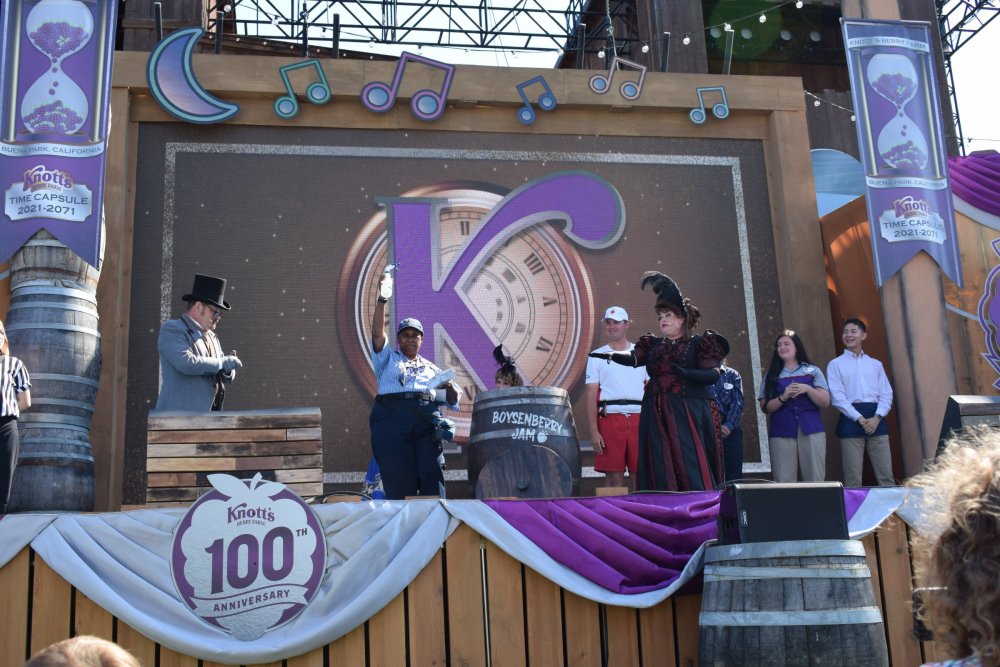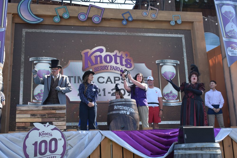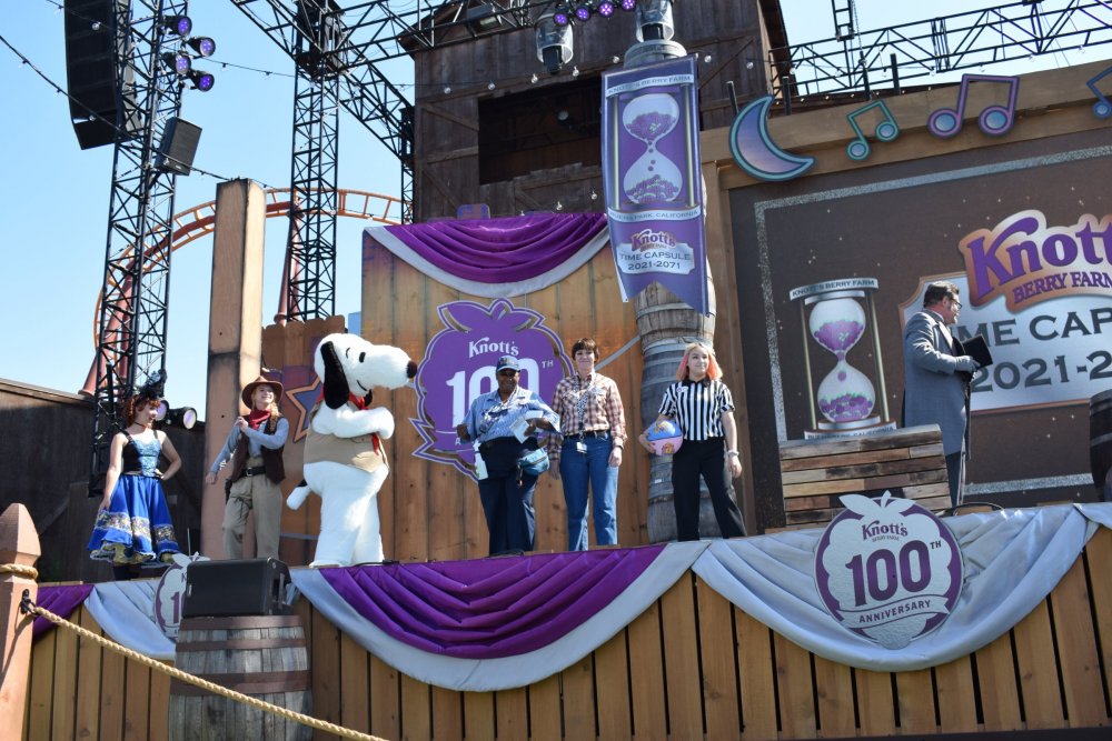 6. As part of the 100th year anniversary, Knott's is burying a time capsule! Theme Park Review was invited to the park to see the festivities. Deputy Mayor Milton C. Howell and Ms. Cameo Kate presided over the show. The Time Capsule is scheduled to be opened in 50 years on June 30, 2071. Items were placed into a large boysenberry jam barrel. First, Whittles came out and put the first item into the barrel, a golden nugget. Next, Knott's associates were led on stage by Snoopy. One by one, they each placed an item(s) into the barrel. Finally, a picture of everyone watching the ceremony was taken that will be placed in the capsule as well. The capsule is going to be buried in front of the new ride, Bear-y Tales: Return to the Fair. We received a nice booklet with a timeline of Knott's 100 year history. Whittles brought a gold nugget. Banner with employee signatures. A tube from Soak City. Mrs. Knott's Chicken Dinner menu and pie pan. Seeds and a jar of dirt from Knott's berry vines. The girls took off their garter belts and put them in the time capsule. A harness from the Stage Coach. Snoopy put a Snoopy plush into the barrel. A piece of wood from Ghostrider. A box of screws from Ghostrider. A bottle of disinfectant and box of gloves. A roll of toilet paper. Kids from The Boys and Girls club of Buena Park. Sealed and ready to be buried.