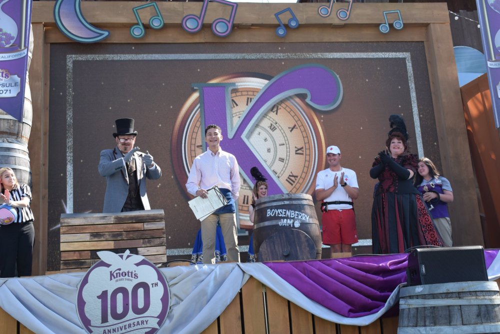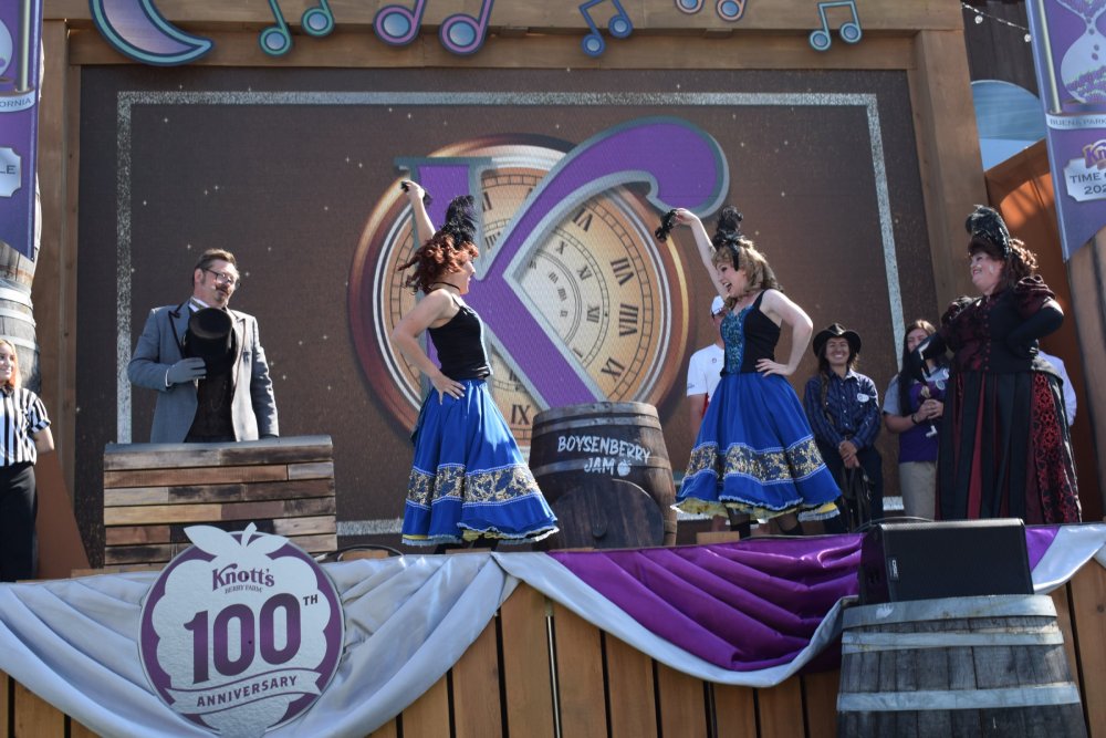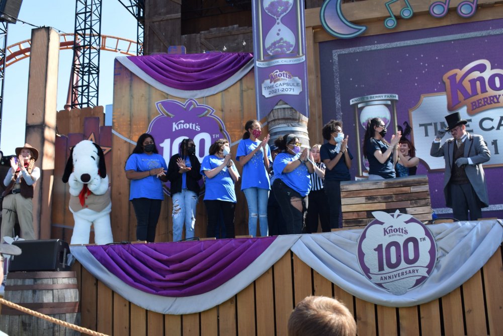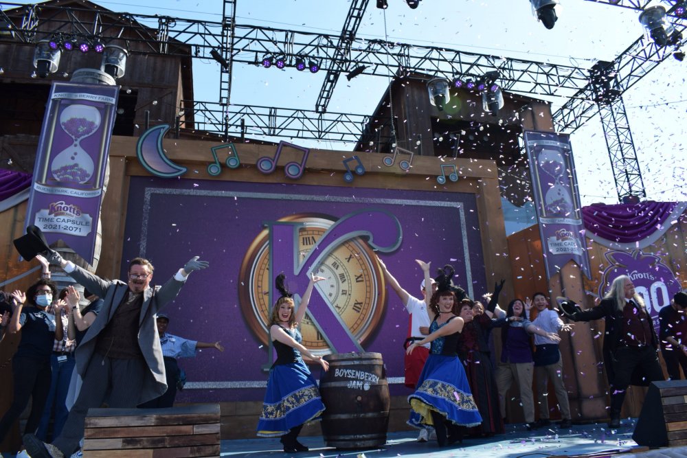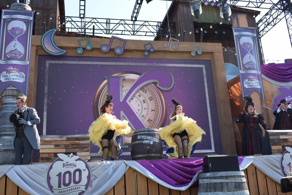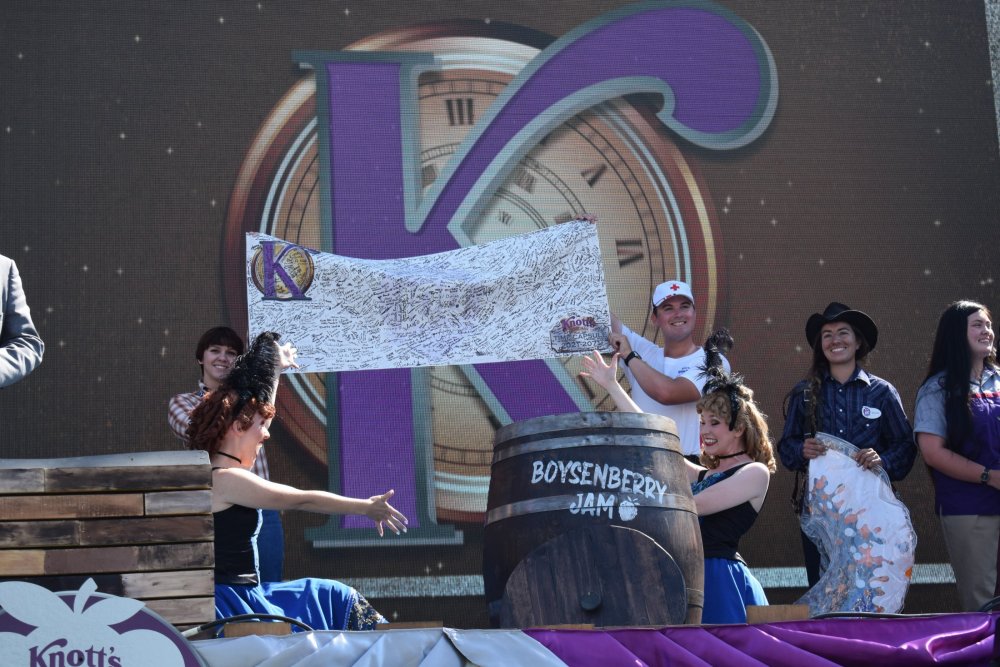 6. As part of the 100th year anniversary, Knott's is burying a time capsule! Theme Park Review was invited to the park to see the festivities. Deputy Mayor Milton C. Howell and Ms. Cameo Kate presided over the show. The Time Capsule is scheduled to be opened in 50 years on June 30, 2071. Items were placed into a large boysenberry jam barrel. First, Whittles came out and put the first item into the barrel, a golden nugget. Next, Knott's associates were led on stage by Snoopy. One by one, they each placed an item(s) into the barrel. Finally, a picture of everyone watching the ceremony was taken that will be placed in the capsule as well. The capsule is going to be buried in front of the new ride, Bear-y Tales: Return to the Fair. We received a nice booklet with a timeline of Knott's 100 year history. Whittles brought a gold nugget. Banner with employee signatures. A tube from Soak City. Mrs. Knott's Chicken Dinner menu and pie pan. Seeds and a jar of dirt from Knott's berry vines. The girls took off their garter belts and put them in the time capsule. A harness from the Stage Coach. Snoopy put a Snoopy plush into the barrel. A piece of wood from Ghostrider. A box of screws from Ghostrider. A bottle of disinfectant and box of gloves. A roll of toilet paper. Kids from The Boys and Girls club of Buena Park. Sealed and ready to be buried.