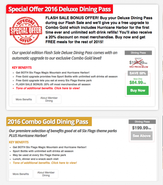 That explains that! I have the dining pass that expires at the end of this year. So I guess I'll purchase this to expand across the parks. If you find out how that works (gold pass membership + non-membership dining pass) please update Just got off the phone with SF. Basically, there's no gold pass membership dining option, only the $84.99 option. When you purchase a new membership + dining pass, the dining pass will just end at the end of 2016, and the membership will continue. No way to pass your current pass/dining to anyone else (no surprise there). yeah, i screwed up and shouldn't have bought the membership dining pass when i did. oh well, i'm still going to get this one, and just cancel the membership asap in june. guess it's not as bad as buying a cedar fair platinum pass, and not using it yet this year. i'm only 3 miles from knott's, you'd think i'd go at least once. lol