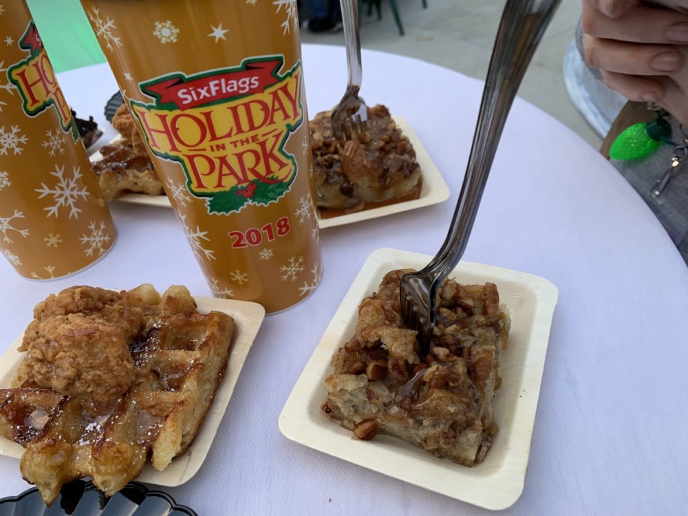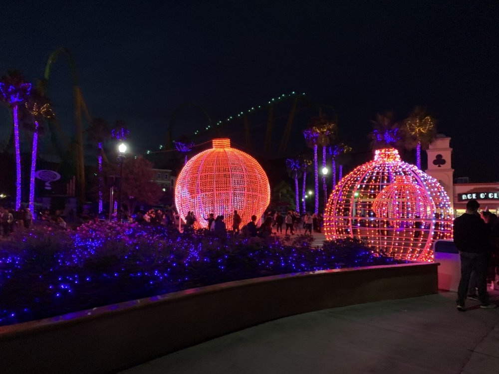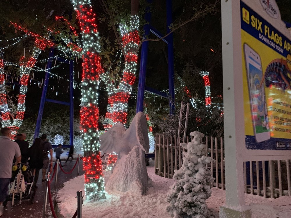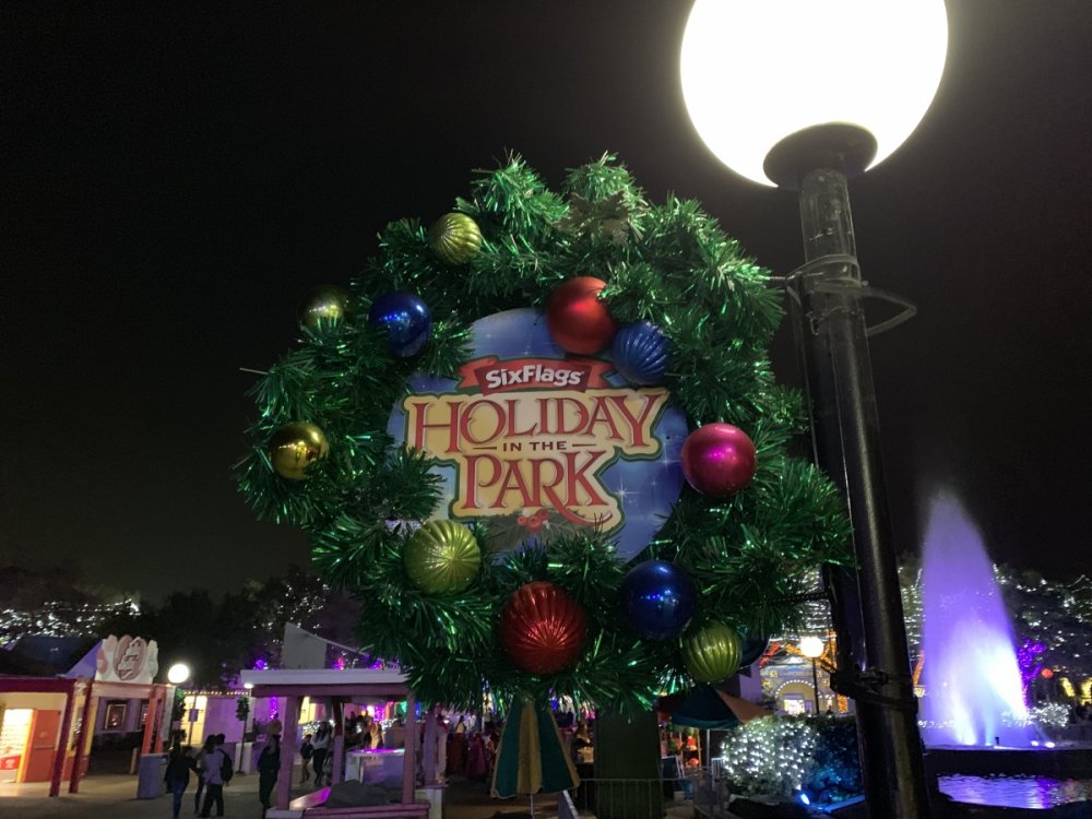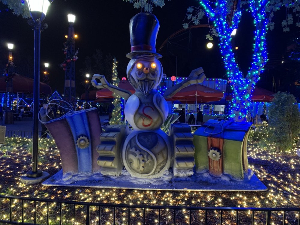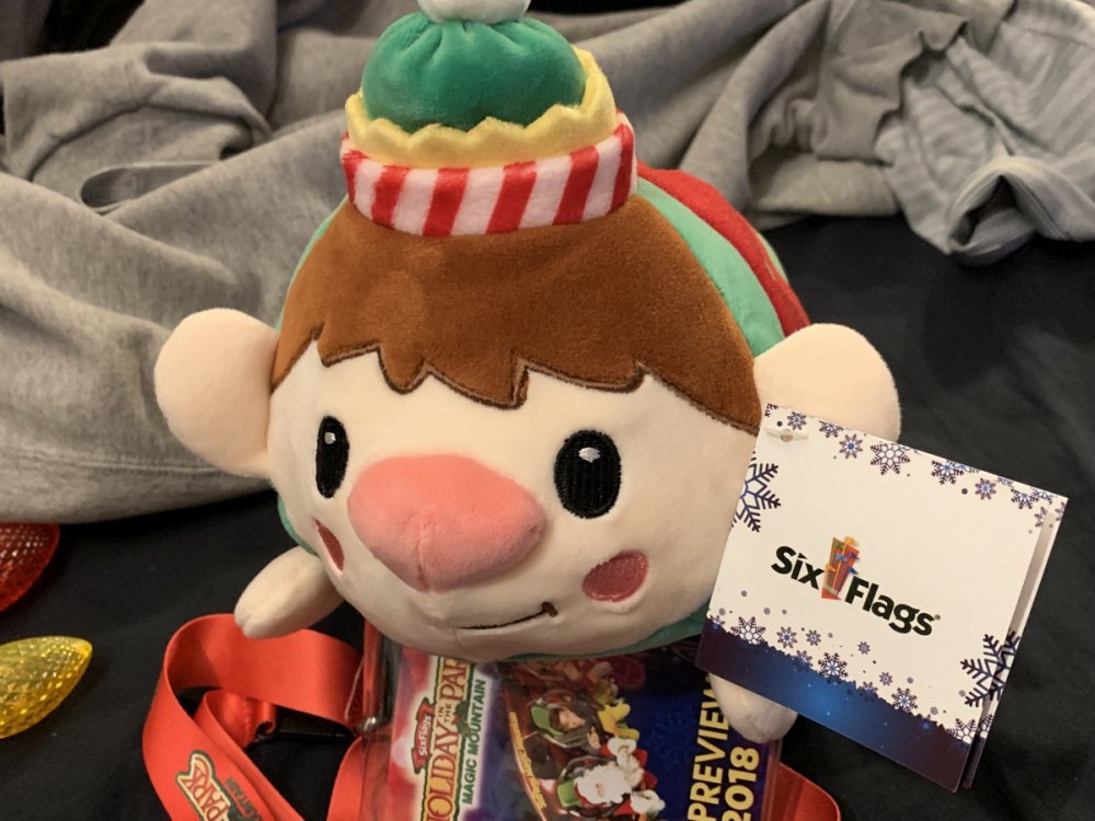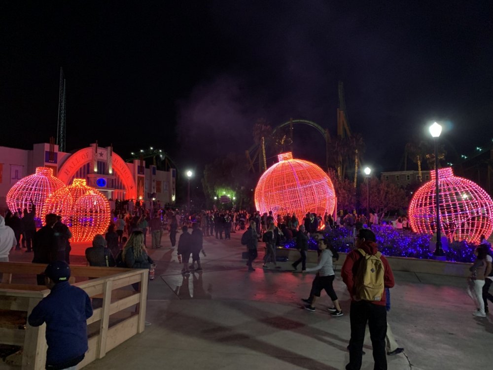 Holiday in the Park opening night!! Theme Park Review was invited to experience opening night of Holiday in the Park. We got to sample all the foods that will be available during "Taste of the Holidays Food Festival". It runs Dec. 15th-30th. I believe it will be one of those punch card type deals. SFMM really looks impressive this year. There are next to no spots that aren't lit up. New this year is Merry Lane in Metropolis. Huge ball ornaments dominate the landscape with colorful light shows. Of course it snows here too every 20 minutes I believe. Santa's Cottage is also new this year. It's located in front of Bugs Bunny World. Santa's there of course being it's his cottage, and there's crafts for children also. Santa even got to meet some Kardashian's while we were there tonight. On to some pictures! Food! More food! And More Food! This was my favorite. Chicken and Waffle. Real crispy tender chicken nugget. The waffle is like infused with syrup. So rich and delicious! Hot chocolate to go with a peppermint brownie and pork cranberry slider. After losing the world series bet to SFNE, Neal had to wear a Red Sox jersey all day along with naming Revolution to Red Sox Revolution. San Onofre at SFMM Orange ball Blue ball 4 balls Someone stepped on a plug. Entrance to the Gleampunk District S'Mores Peppermint Bark, and S'more Root Beer Cake Peppermint Pudding Parfait. Bacon Pecan Yams Prociutto Mac and Cheese. I think that's a typo, but that's what the card said. SFMM is selling these cute little guys for charity. A buy one give one. They will donate one with every purchase. There are a number of different ones to choose from. SFMM is selling these cute little guys for charity. A buy one give one. They will donate one with every purchase. There are a number of different ones to choose from. That's some of the most fun I've had at SFMM besides West Coast Bash. And I didn't even ride one ride! Not even the bus after parking in the gravel lot. There was a good sized car show in the parking lot, KROQ I believe had extended hours for their fans, and first night of Holiday in the Park had the place jam packed. Everyone seemed to be in such a good mood. It really was a great first night of Holiday in the Park. Look forward to getting back soon!! Big thanks to everyone at SFMM for their hospitality!