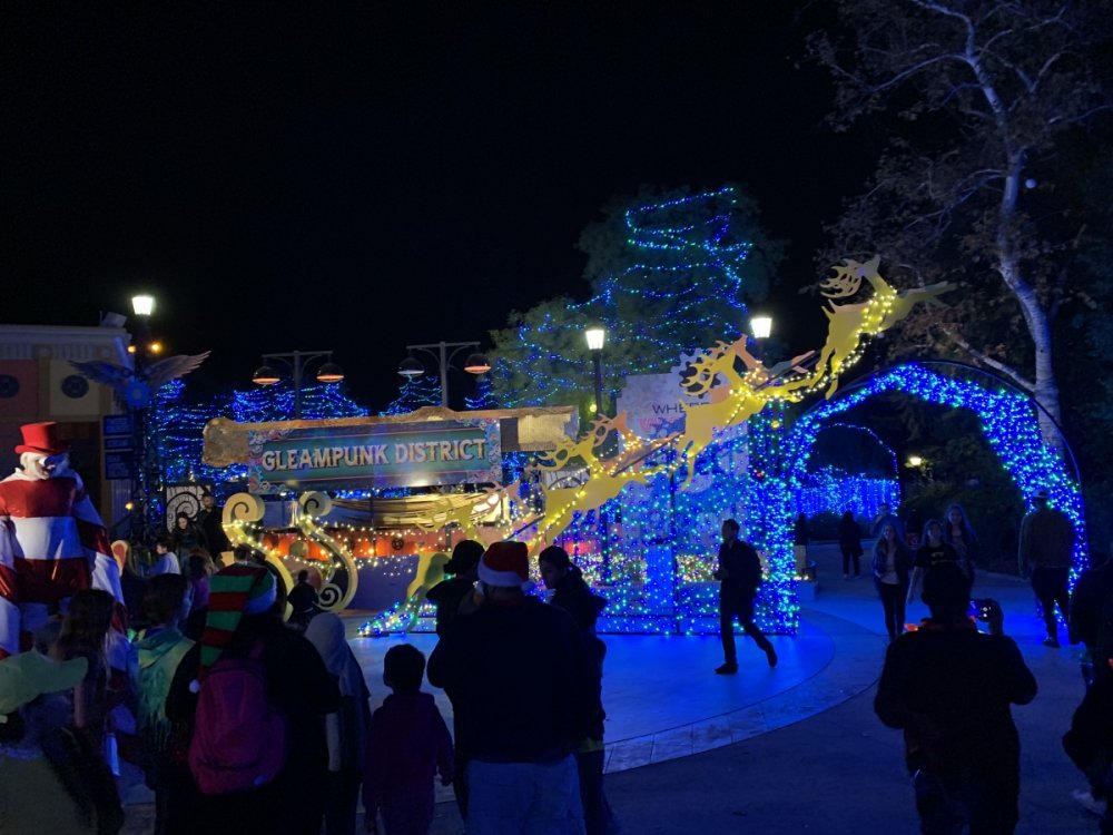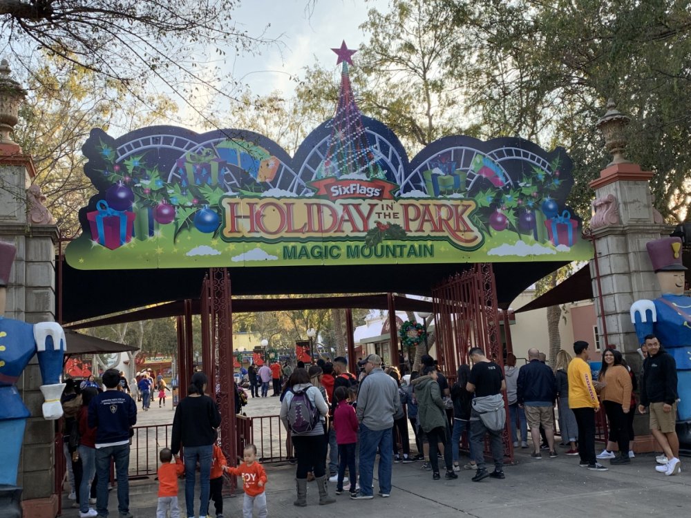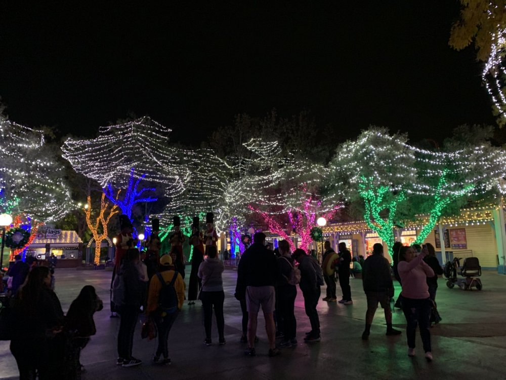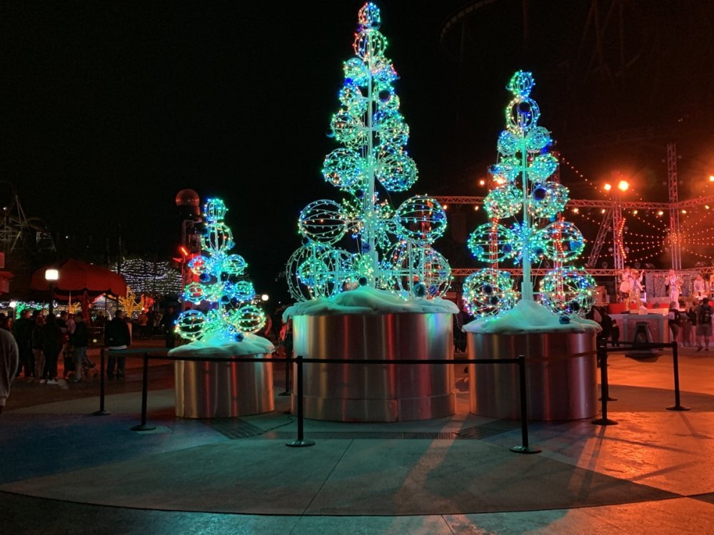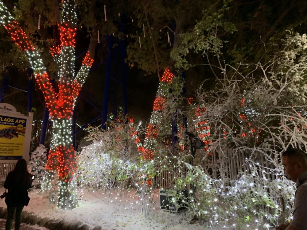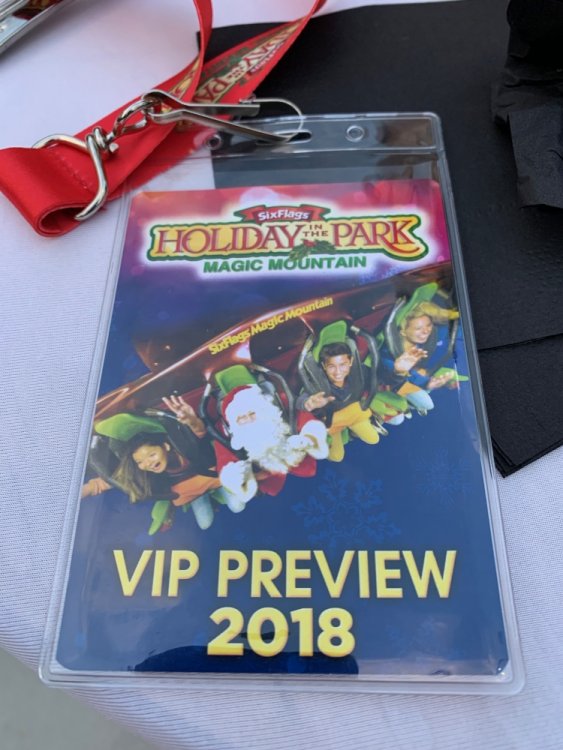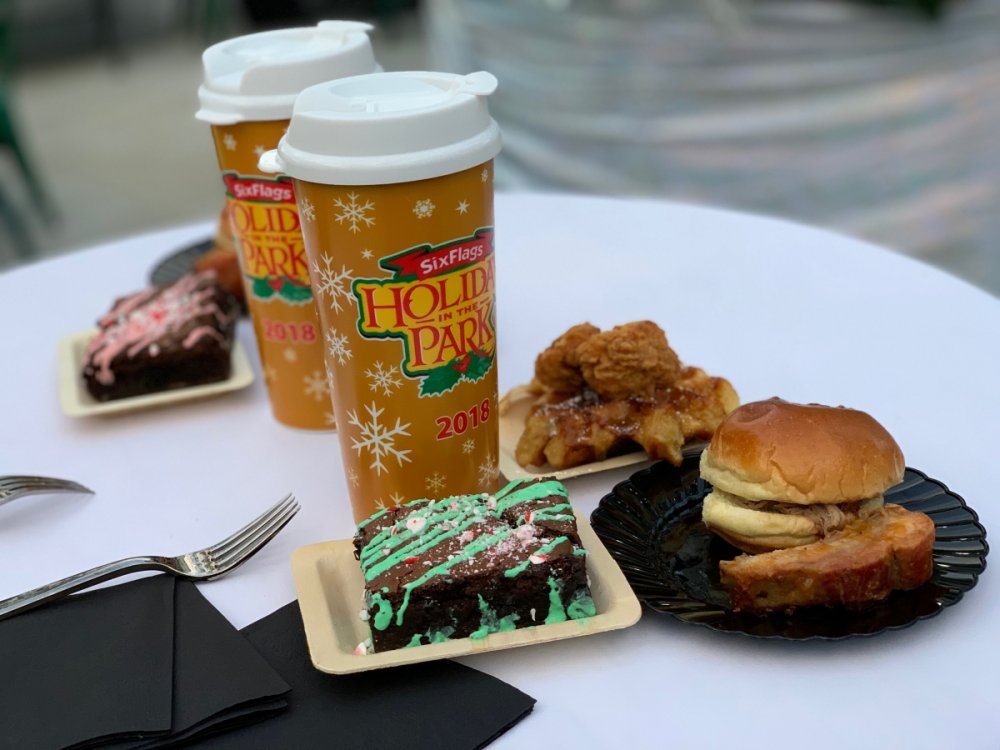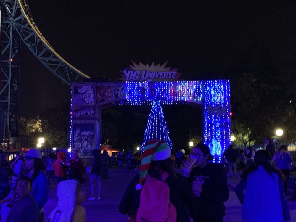 Holiday in the Park opening night!! Theme Park Review was invited to experience opening night of Holiday in the Park. We got to sample all the foods that will be available during "Taste of the Holidays Food Festival". It runs Dec. 15th-30th. I believe it will be one of those punch card type deals. SFMM really looks impressive this year. There are next to no spots that aren't lit up. New this year is Merry Lane in Metropolis. Huge ball ornaments dominate the landscape with colorful light shows. Of course it snows here too every 20 minutes I believe. Santa's Cottage is also new this year. It's located in front of Bugs Bunny World. Santa's there of course being it's his cottage, and there's crafts for children also. Santa even got to meet some Kardashian's while we were there tonight. On to some pictures! Food! More food! And More Food! This was my favorite. Chicken and Waffle. Real crispy tender chicken nugget. The waffle is like infused with syrup. So rich and delicious! Hot chocolate to go with a peppermint brownie and pork cranberry slider. After losing the world series bet to SFNE, Neal had to wear a Red Sox jersey all day along with naming Revolution to Red Sox Revolution. San Onofre at SFMM Orange ball Blue ball 4 balls Someone stepped on a plug. Entrance to the Gleampunk District S'Mores Peppermint Bark, and S'more Root Beer Cake Peppermint Pudding Parfait. Bacon Pecan Yams Prociutto Mac and Cheese. I think that's a typo, but that's what the card said. SFMM is selling these cute little guys for charity. A buy one give one. They will donate one with every purchase. There are a number of different ones to choose from. SFMM is selling these cute little guys for charity. A buy one give one. They will donate one with every purchase. There are a number of different ones to choose from. That's some of the most fun I've had at SFMM besides West Coast Bash. And I didn't even ride one ride! Not even the bus after parking in the gravel lot. There was a good sized car show in the parking lot, KROQ I believe had extended hours for their fans, and first night of Holiday in the Park had the place jam packed. Everyone seemed to be in such a good mood. It really was a great first night of Holiday in the Park. Look forward to getting back soon!! Big thanks to everyone at SFMM for their hospitality!