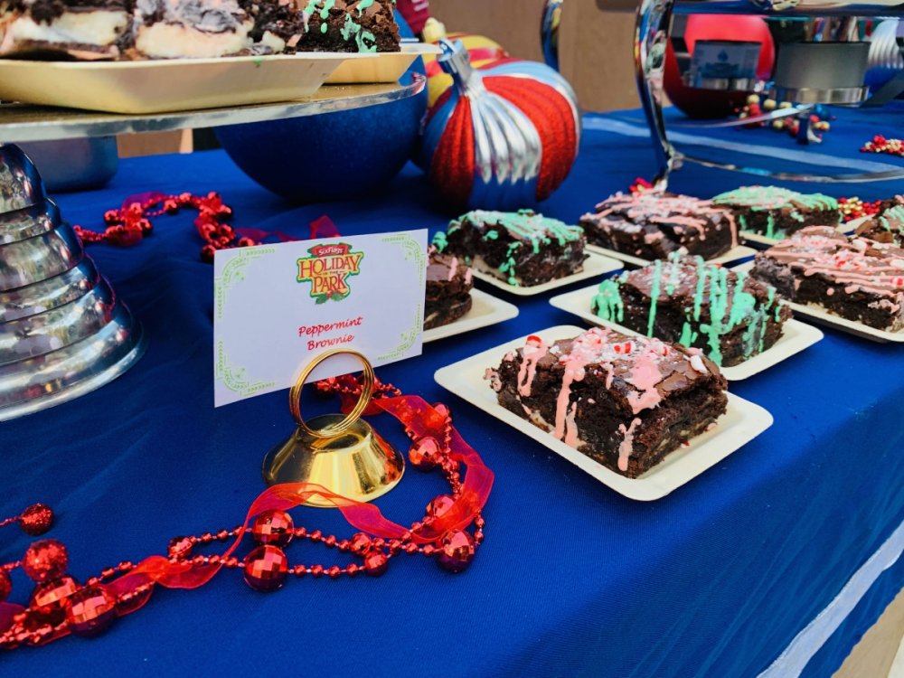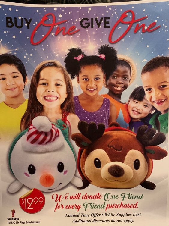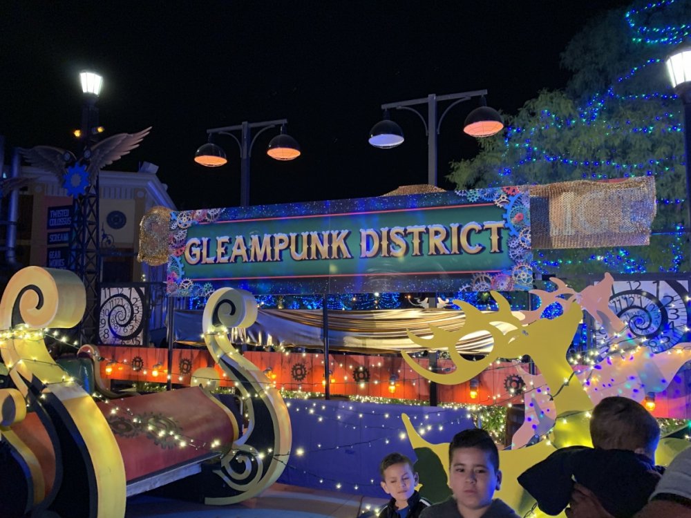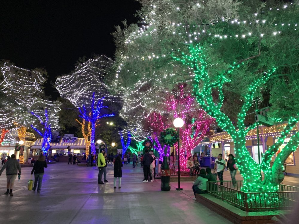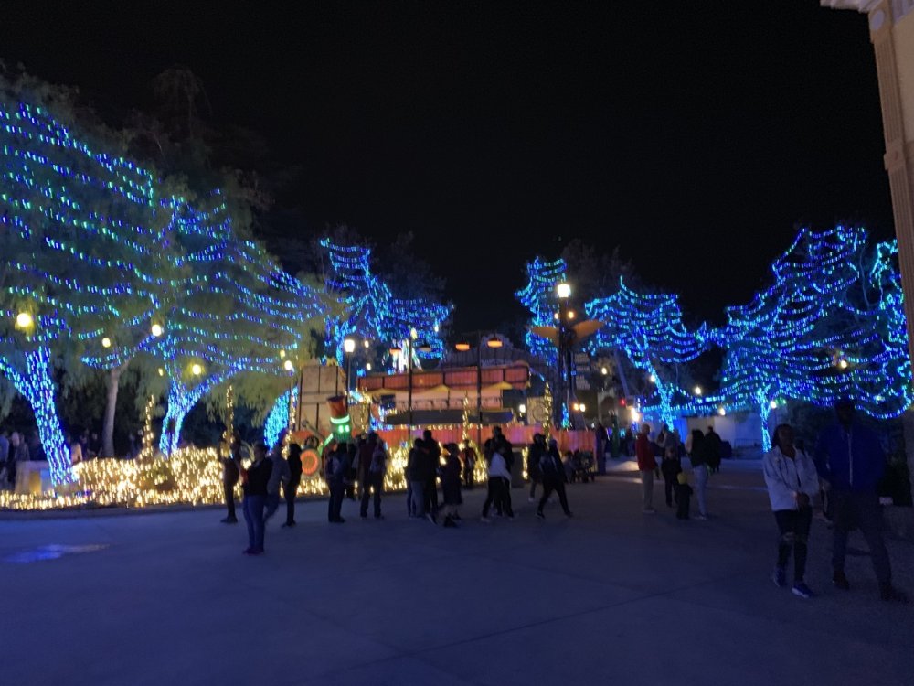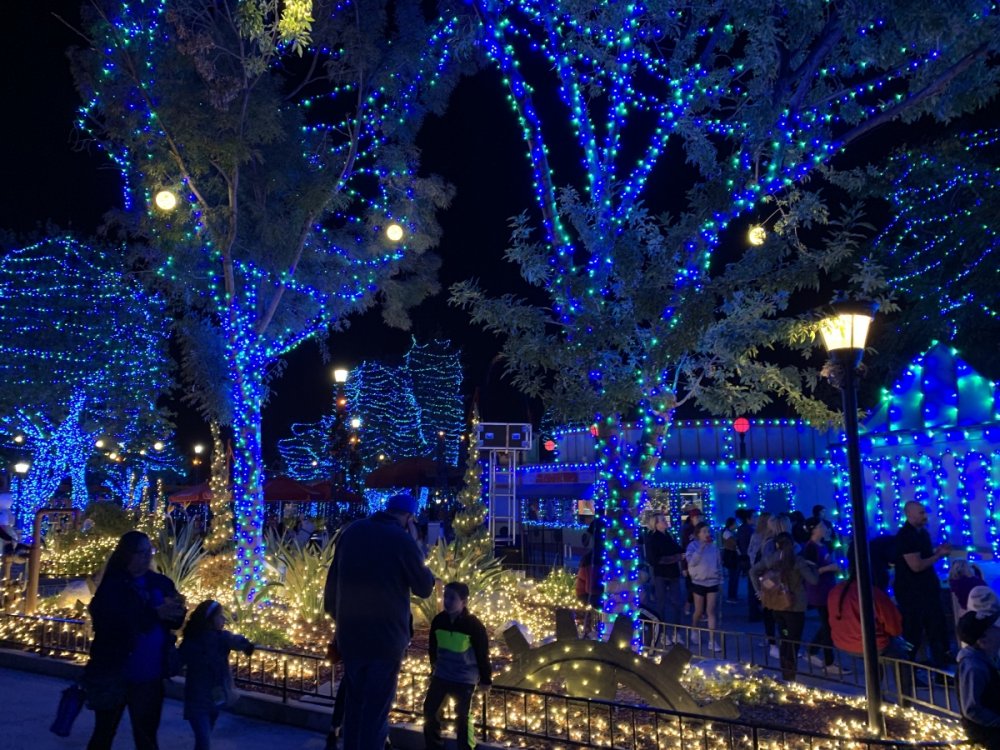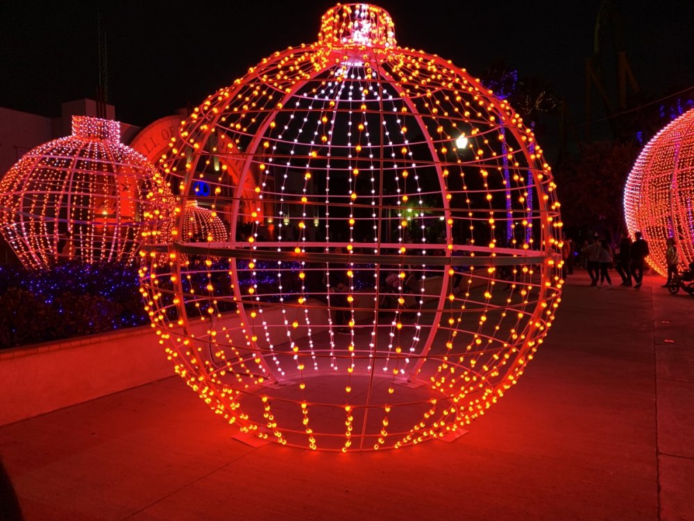 Holiday in the Park opening night!! Theme Park Review was invited to experience opening night of Holiday in the Park. We got to sample all the foods that will be available during "Taste of the Holidays Food Festival". It runs Dec. 15th-30th. I believe it will be one of those punch card type deals. SFMM really looks impressive this year. There are next to no spots that aren't lit up. New this year is Merry Lane in Metropolis. Huge ball ornaments dominate the landscape with colorful light shows. Of course it snows here too every 20 minutes I believe. Santa's Cottage is also new this year. It's located in front of Bugs Bunny World. Santa's there of course being it's his cottage, and there's crafts for children also. Santa even got to meet some Kardashian's while we were there tonight. On to some pictures! Food! More food! And More Food! This was my favorite. Chicken and Waffle. Real crispy tender chicken nugget. The waffle is like infused with syrup. So rich and delicious! Hot chocolate to go with a peppermint brownie and pork cranberry slider. After losing the world series bet to SFNE, Neal had to wear a Red Sox jersey all day along with naming Revolution to Red Sox Revolution. San Onofre at SFMM Orange ball Blue ball 4 balls Someone stepped on a plug. Entrance to the Gleampunk District S'Mores Peppermint Bark, and S'more Root Beer Cake Peppermint Pudding Parfait. Bacon Pecan Yams Prociutto Mac and Cheese. I think that's a typo, but that's what the card said. SFMM is selling these cute little guys for charity. A buy one give one. They will donate one with every purchase. There are a number of different ones to choose from. SFMM is selling these cute little guys for charity. A buy one give one. They will donate one with every purchase. There are a number of different ones to choose from. That's some of the most fun I've had at SFMM besides West Coast Bash. And I didn't even ride one ride! Not even the bus after parking in the gravel lot. There was a good sized car show in the parking lot, KROQ I believe had extended hours for their fans, and first night of Holiday in the Park had the place jam packed. Everyone seemed to be in such a good mood. It really was a great first night of Holiday in the Park. Look forward to getting back soon!! Big thanks to everyone at SFMM for their hospitality!