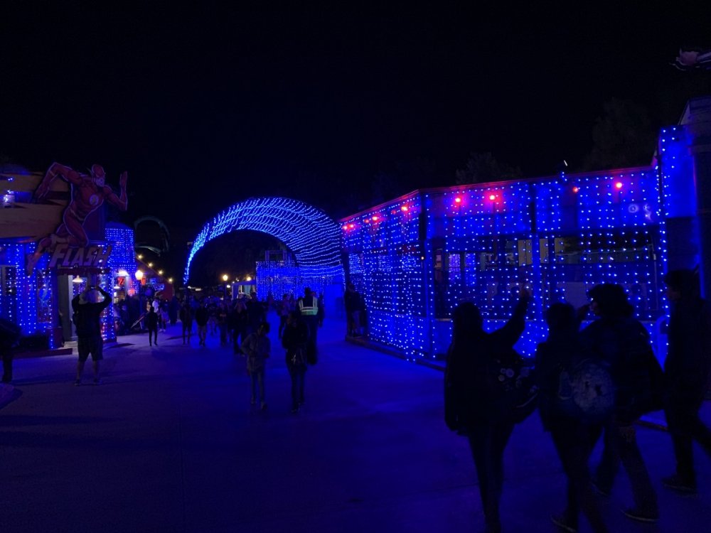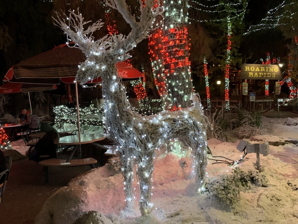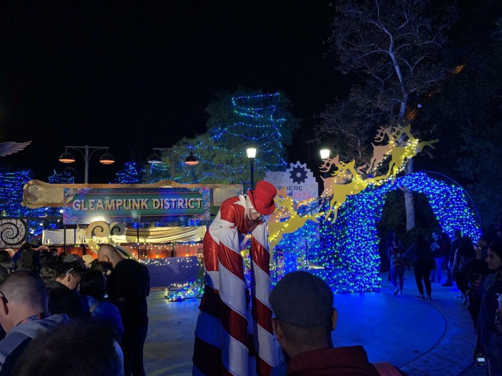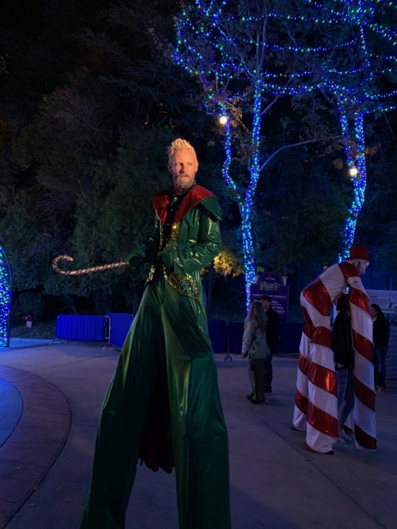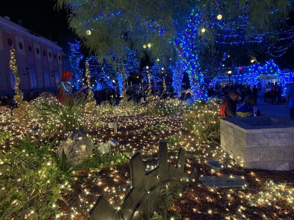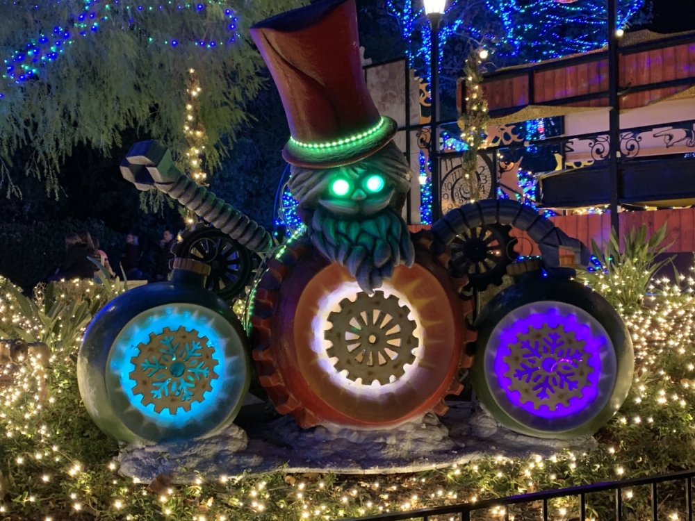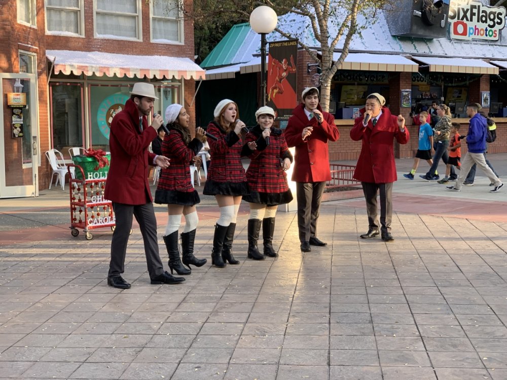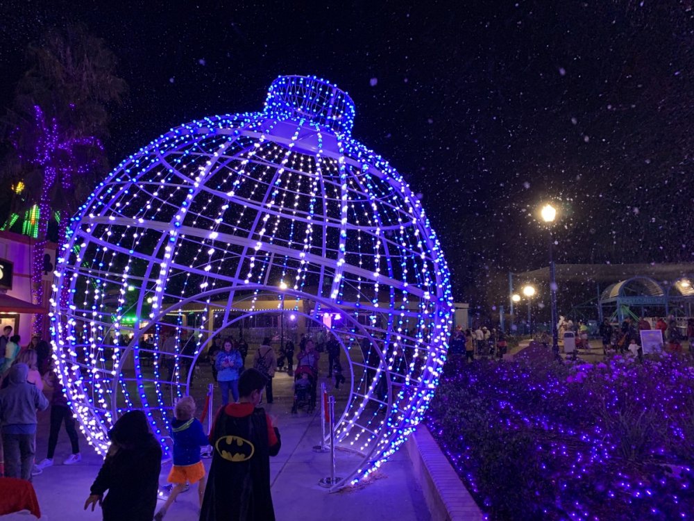 Holiday in the Park opening night!! Theme Park Review was invited to experience opening night of Holiday in the Park. We got to sample all the foods that will be available during "Taste of the Holidays Food Festival". It runs Dec. 15th-30th. I believe it will be one of those punch card type deals. SFMM really looks impressive this year. There are next to no spots that aren't lit up. New this year is Merry Lane in Metropolis. Huge ball ornaments dominate the landscape with colorful light shows. Of course it snows here too every 20 minutes I believe. Santa's Cottage is also new this year. It's located in front of Bugs Bunny World. Santa's there of course being it's his cottage, and there's crafts for children also. Santa even got to meet some Kardashian's while we were there tonight. On to some pictures! Food! More food! And More Food! This was my favorite. Chicken and Waffle. Real crispy tender chicken nugget. The waffle is like infused with syrup. So rich and delicious! Hot chocolate to go with a peppermint brownie and pork cranberry slider. After losing the world series bet to SFNE, Neal had to wear a Red Sox jersey all day along with naming Revolution to Red Sox Revolution. San Onofre at SFMM Orange ball Blue ball 4 balls Someone stepped on a plug. Entrance to the Gleampunk District S'Mores Peppermint Bark, and S'more Root Beer Cake Peppermint Pudding Parfait. Bacon Pecan Yams Prociutto Mac and Cheese. I think that's a typo, but that's what the card said. SFMM is selling these cute little guys for charity. A buy one give one. They will donate one with every purchase. There are a number of different ones to choose from. SFMM is selling these cute little guys for charity. A buy one give one. They will donate one with every purchase. There are a number of different ones to choose from. That's some of the most fun I've had at SFMM besides West Coast Bash. And I didn't even ride one ride! Not even the bus after parking in the gravel lot. There was a good sized car show in the parking lot, KROQ I believe had extended hours for their fans, and first night of Holiday in the Park had the place jam packed. Everyone seemed to be in such a good mood. It really was a great first night of Holiday in the Park. Look forward to getting back soon!! Big thanks to everyone at SFMM for their hospitality!