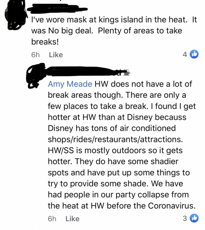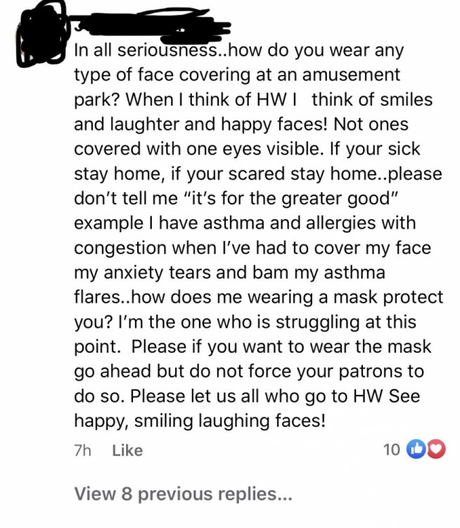 I know the reasons why they didn’t mandate masks at the park. Those are they weren’t required required by the state at the time, the majority of their patrons are stubborn/kinda ignorant ( I’ll show you what I mean later) and they don’t have the staffing numbers to actually enforce it. With that said, it would have been easier to take the precaution even tho it wasn’t required by the state and enforce it from the beginning of the season instead of waiting until it was mandated and having to change your policies and signage in the park again. I always where mine in the dry park and I’m looking into finding one to wear in the waterpark. These are some screenshots of the season pass holder group I’m in. These are just ones from today. HW usually deletes the really bad posts or comments before I even think about screenshoting it. Last week someone posted in the group asking if they could start a petition to get the employees out of wearing a mask because it’s too hot outside. -