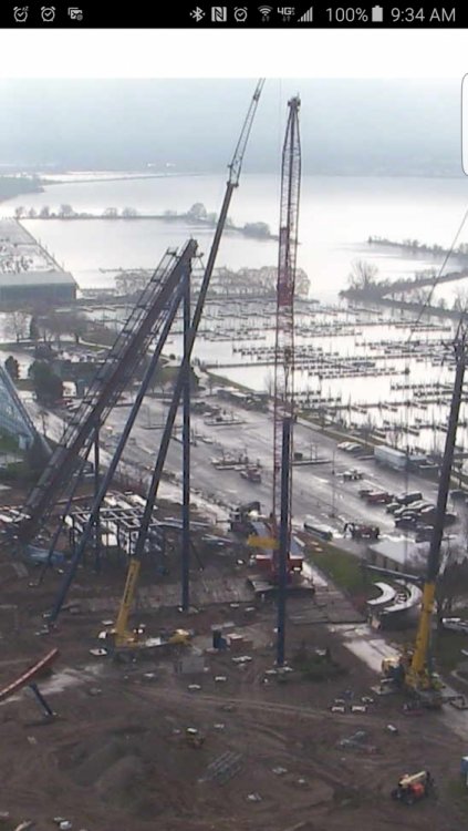 ^ I was thinking that they would lift the last part of the lift and crest into place, bolt it together, and keep supporting it using the big red crane, and then lift the turn into place using one of the other cranes and bolt all that together... but we shall see!! -