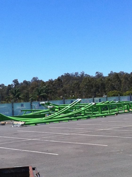 So the construction of the new coaster for Movie world is starting to show some form of shape and while it does not look like much from the ground, I was able to get some overhead pictures from about a week ago of the site. I did get some photos from site however they did not turn out well enough to post. We can confirm creates onsite with Mack coaster labels all over them. The park has already stated that this will be one of the most extreme coasters Australia has ever seen. I will post some more photos up next weekend (if that's ok) from the site to see how the works are progressing, or you can head over to the parkz.com.au site and see ones from this weekend. The one thing I ask, is does the layout of this ride remind anyone of a Mack ride already completed, or are we looking at a first of a kind? Cheers. Section closest to the main park. Possibly station area. Main footer section End of construction area at this stage.