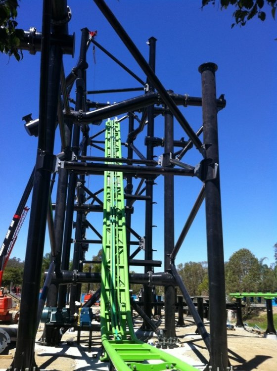 So the new DC Rivals coaster has almost completed track install (if they fell behind today it will be completed tomorrow). The guys over at Parkz.com.au have a full update with plenty of pics, however here is one from the site today showing the new ride in comparison to the Green Lantern coaster. Enjoy. The new DC Rivals Coaster about to top out...