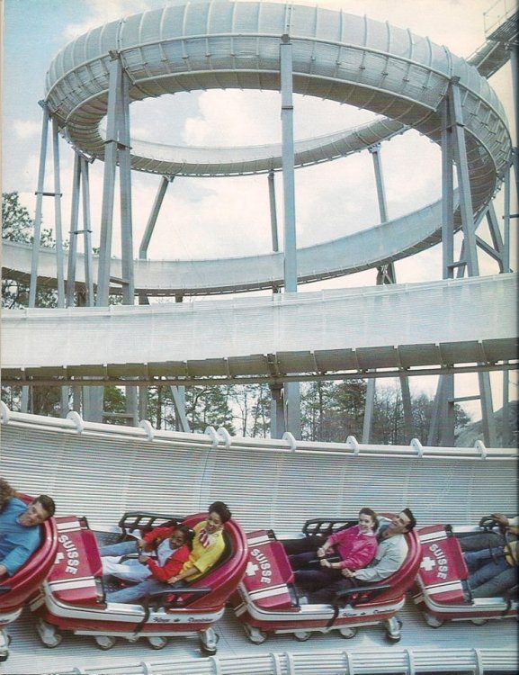 KDGY FACT: Built in 1988, Avalanche is still the only ride of its type ever constructed in North America. Here's a photo taken on media day (March 1988) when the ride had 4, 6 car trains and each train was a specific Country. The trains were changed later in the year to have 7 cars along with multiple countries per train. (the France car was then added too) -