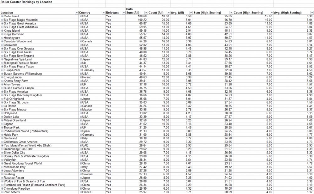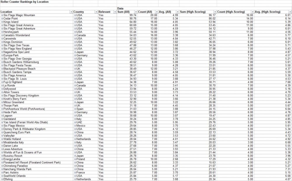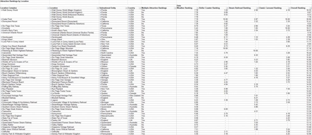 Long time, no see. I did not touch any of my attraction ranking spreadsheets for almost all of 2017, and now I revisited them and made some new updates. With the carousels, I removed all of the ones with only molded metal figures; and with the steam railroads, I removed everything with a track gauge less than 15 inches (minimum gauge). The most significant update, however, was with the roller coasters. First, I removed the rule that any operator running more than one roller coaster gets included, regardless of the size of the roller coasters. Under this rule, many operators running nothing but crummy, rusting carnival roller coasters got included (Wacky Worm city, basically). Second, I lowered the thresholds for height, length, and speed that a roller coaster needs to be included. Those new thresholds are 64.35 ft. tall or more, 1,930.44 ft. long or more, and 43.87 mph or more. These new thresholds revolve around the acceleration of gravity, which makes them feel a lot more logical than the old ones. Specifically, the height and speed stats revolve around how fast an object in free fall travels after exactly two seconds, while the length stat references how far an object will travel on an incline starting from 64.35 ft., if the time it takes to reach the ground is 60 seconds. When you look at the height and speed stats in metric form, they are about 19.6 meters and 19.6 meters/second, respectively. This seems to a natural dividing line between junior and kiddie roller coasters, and bigger, more noteworthy roller coasters. With the combined mass removal due to the first change and the mass addition due to the second change, and general updates from not having updated it for a year, there was a net loss of around 500 roller coasters on the spreadsheet. Again, almost all of the ones removed were garbage from places that most people have never heard of, so they won't be missed. Also, here are the new averages: 62.29 ft.; 1,738.85 ft.; 34.95 mph. As far as the one roller coaster that comes the closest to the new thresholds, where all three of its stats are greater than or equal to the thresholds, that award goes to White Lightning at Fun Spot America Orlando (69.67 ft.; 2,032.00 ft.; 44.30 mph). I have thus determined that this roller coaster is the "perfect" roller coaster, in that it's size is almost exactly in the middle overall compared to all other roller coasters, and hence appeals to the widest audience possible (not too big to scare away squeamish people, but not too small for thrillseekers to dismiss, and so forth). Plus, it's in Orlando, yet it's not in one of the big parks, so you don't have to pay for parking, travel a mile from the parking lot to the gate, or have to deal with giant crowds to get to it. Here's its POV video: https://www.youtube.com/watch?v=8eAFfv-aLzg. So, without further ado, here is the latest Top 50 on the Roller Coaster Rankings Spreadsheet: -