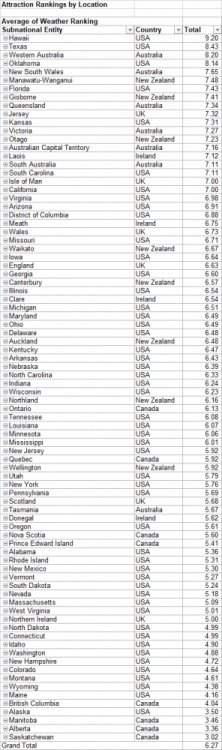 Here's the Attraction Rankings spreadsheet showing only the Average Weather Ranking for each state/province. -