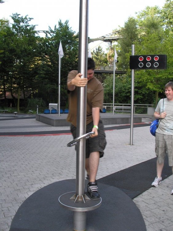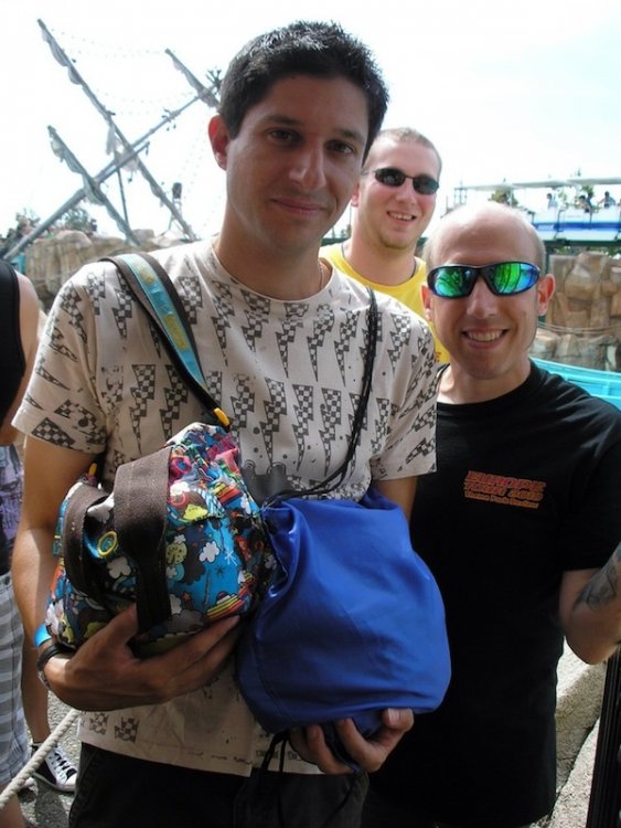 ^ Every time it rains, I have flash-backs to U571 .. scary stuff Park 4 - Europa Park (part 1) The drive through Switzerland yesterday evening was stunning (seriously, mind meltingly stunning). Mountains giving away to beautiful lakes, surrounded by small villages ... All with the sun setting as a backdrop. It was quite the amazing drive, and ended up with us arriving at the Hotel Colosseo in Germany. I have spent the last week in Italy, and now just arrived in Germany. It takes a little mental adjustment to make that switch, but it's quite a bit more weird because I'm staying in an Italian themed hotel! No worries though, this hotel is fabulous... After arriving on Wednesday night we sat outside for a while and had some drinks, then went to the upstairs bar for some more. This bar is curious in that the mens bathroom has a recording of a Ferrari which plays every few minutes. I'm not complaining though, Ferraris are awesome! This morning (after only about 3 hours sleep), it was time to hit Europa Park. This is the park I was most looking forward to on the whole trip (second are Phantasialand on Saturday, and the German fair tomorrow). I have heard only extremely positive things about this park, so it had much to live up to. Well, it succeeded. Not only that, but I think it's safe to say that I want to marry Europa Park and have its babies! The park is divided up into thirteen sections, and even after being there all day there were still a few whole sections we didn't even step foot into. The map is so big that it requires two people to hold it: We started the day with an entire hour of Exclusive Ride Time on the new coaster Blue Fire. A+ all the way, baby .. In fact I think I might have to reorder all my other rides! This coaster is really odd in that it's not super fast, nor does it pull particularly high forces, but OMFG is it fun. So much fun! The layout and theming is brilliant, and the way it interacts with everything around is perfect. Plus it flips you upside-down 4 times, yet there's only a lap-bar. It's just so awesome! I kept having to fight the urge to buy it ice-cream. Renee and I are right up front on Blue Fire. Eric joined us for several spins, and agrees that it is one terrific ride. With three trains running, our Exclusive Ride Time was very very exclusive. Be very envious! Here are some general pictures of Blue Fire awesomeness... After ERT a few if us were lucky enough to get a backstage tour of the park. This was great, I love seeing how these parks are run, and Europa seems quite like the Chocolate Factory. Backstage was BUSY, with people running around like very busy little bees. Europa was spectacularly clean and well run, and it all starts with a super efficient backstage area. Along the way we passed some beer kegs, which Derek and Piers enjoyed.. Europa is run by the Mack corporation (they make rides) and many Mack ride systems are showcased here. The rides are run at maximum capacity, and even though it was a very crowded day, and a few lines approached 45 minutes, the waits were not bad at all. The coasters dispatch on remarkable 20-30 second intervals (basically that's unheard of on the US), so while you're waiting in line, you're pretty much never stopped. Seriously, sometimes it was tough to take photos because the lines just kept moving so much! One of the great Mack ride systems is this cross between a coaster and a boat ride. You are in fact sitting in a boat, that ascends a lift-hill, runs along some coaster track with hills and turns and such; but then it can suddenly splash down into water. Very very cool stuff. Our group was pretty big, and fortunately there were always a few people with bags. On the water rides these bags were used to protect phones, cameras and even smokes. And if someone decides that they don't want to ride, well then they become "Bag Bitch" for everyone else. The irony of this photo is that I was in-fact going to ride, but I had opted to sit in one if the seats which doesn't get very wet. I tells ya, I get no respect! That's Ryan on the right, and Jon Locke behind. Euro-Mir!! If there ever was an award for the most awesome coaster just for then sake of being amazingly awesome, then Euro-Mir would be the undisputed champion. You sit back-to back in these four-person cars, which make up a small train. One pair faces forwards, and the other backwards (so you face the people in the next/previous car). It's all themed to the Russian space race, and for some reason there is this kick ass techno tune thumping in line and in the station ... And also all the way up the entire lift-hill .. Which takes about 5 minutes! Seriously the lift is this loooooong spiral (which can handle like 5 trains at once), its in the dark, with disco lights, and the techno track. Oh and the cars are motorized, so that they spin around (not very fast) at specific points, so you're always seeing different passengers. It's insanely fun, and we danced and raved our way all the way along this bad-boy. The last time Theme Park Review was at this park (2008, I believe), they actually got Exclusive Ride Time on Euro-Mir ... And more envious, I could not be. Yes, the building is mirrored, so aside from the neighboring riders, you can also see yourself. Lou and Scottish Steve are getting ready to rave while waiting for Euro-Mir. Absolute fun! It's not Spaceship Earth, it's an indoor coaster called Euro-Sat. This was much weaker than Blue Fire and Euro-Mir, but still fun. We have ERT on this tomorrow morning (with the lights on). I'm looking forward do it because it uses the same lifting system as Euro-Mir and I'm curious to see it with the lights on. Oh and note the climbers on there - not sure what they are up to. The other stand-out coaster is Silver Star, which was greatly better than people had lead me to believe; and a mad-mouse that uses an elevator style lift-hill. There are also about a zillion flat-rides, and some great dark rides. We'll have some more time the