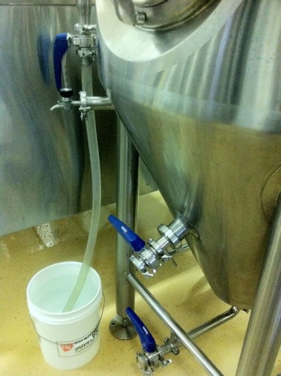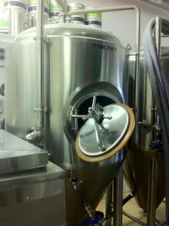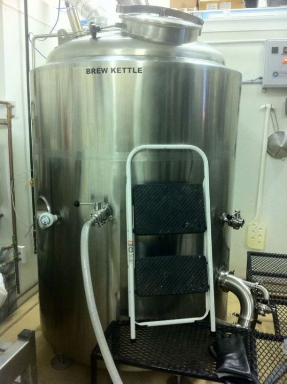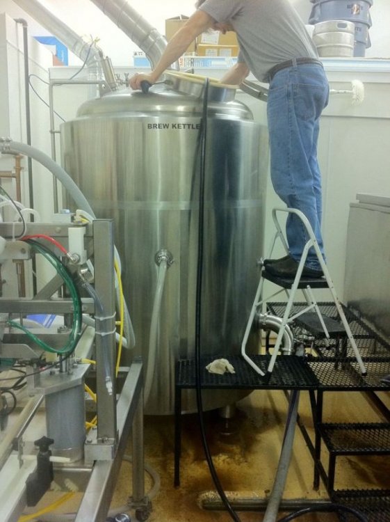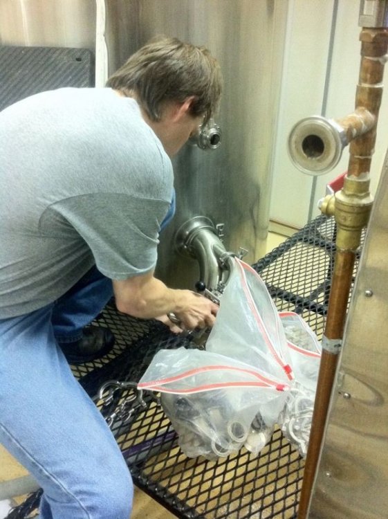 Resuming where we left off for the third (and final) part of the magical journey that is Brewing... Overall I had just a terrifically fun day. I'm not sure I could do this every day, but I genuinely loved it. I'm really appreciative to Tom and Lynne for letting me help out - I already can't wait to do it again Tom pitched the melted chocolate into the boil while Lynne and I were disposing of the spent grains, but once we returned we had a short breather and then it was time to remove the bags of hops. As amusing as this picture looks, it's actually really tough .. Tom has to fish the bags out of an extremely large tank that is full of boiling liquid (hence the gloves and long-sleeves). But he always finds them! With the hops removed, and the beer (still) boiling, Tom starts to prepare to transfer to the fermentation tank. He is running an oxygen line, and in the foreground (the bottle partially full of white liquid) is the yeast. Pumping the beer from the boiler into the fermentation tank. The thick gray hoses carry the actual liquid, and the thinner clear/white hoses carry cold water to cool the beer as it flows through the heat exchanger. Tom is checking the temperature gauge, and making sure that the right amount of oxygen is being added (it's tough to see but there's a glass window and you can see the bubbles in the liquid). If the beer is too warm or the amount of oxygen is off, then the yeast will not do its job correctly. Pitching the yeast into the beer as it fills the fermentation tank! Any time we have to disconnect a hose, some beer spills; however it's such a pretty colour! With all the beer in the fermentation tank, it's time to clean the boiler. This takes well over an hour, and includes Tom actually getting inside there with a scrubbing brush. As the yeast works its magic, gasses will be released and come out of the top of the fermentation tank, through this tube, and bubble up through the water. When I went back to F8 two days later, it was already bubbling like crazy. Very exciting! Cleaning continues ... hosing down the pump. We also have to pump hot (clean) water through everything to clean out any sediment. With the beer in the fermentation tank (where it will stay for about two weeks), and at least half the cleaning done, it was time for a lunch break. Joel (Tom and Lynne's son) joined us for some food and later some pinball too. It was about 3pm by this point, and we'd been on the go since 8:30. Back to work again, and I'm cleaning out the hop bags so they can be reused the next time. This is what used/boiled hops looks like! One (of two) piles of clean fittings for all the plumbing. It's important to stay on top of getting all this stuff clean because it's 4pm now and the tasting room opens in just one hour. This must all be clean, dry and out of the way so that we can deal with glasses and growlers. With about 20 minutes remaining before the tasting room opens, it's time to turn on the taps! With everything ready for customers, Tom handed me a sip of what we had just brewed. It's not even close to done yet (no alcohol, or carbonation), but damn it was good! Then the people came .. we were **slammed**! It was one of the busiest days at F8 since opening, and I spent the next four hours in back washing glasses and growlers (new growlers are slightly cheaper if you bring back the old one). This is just a small percentage of the Growler Madness I had to contend with! We were thinking we could leave by about 7, but we were there until after 9! By the end of the night I had been on my feet for 13 hours, and had only eaten a small (but very tasty) sandwich at about 3pm. Fortunately one customer had brought in a platter of cheese, sausage and crackers for us! Figure 8 has a very cozy and welcoming feel, and there is a growing number of regular (and awesome) customers to back this up. Tom and Lynne get little gifts like this regularly (I'm sure it didn't hurt being 2 days before Christmas!).