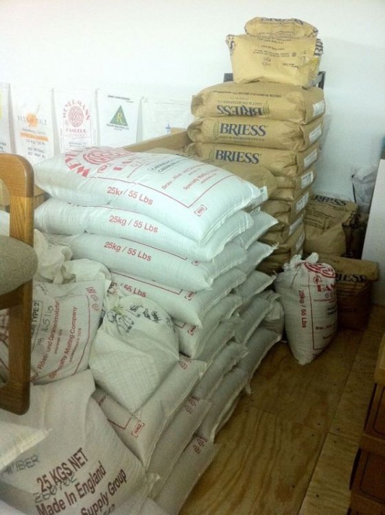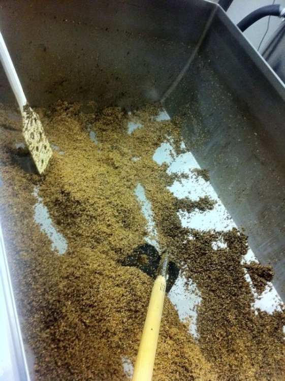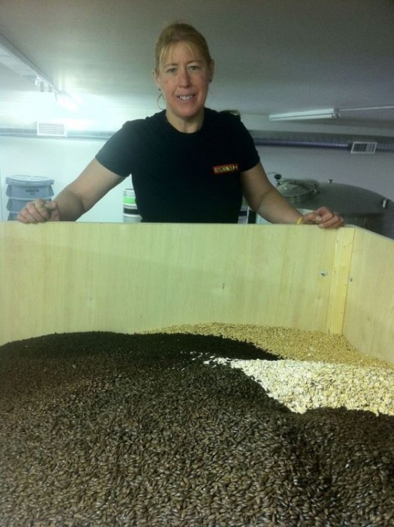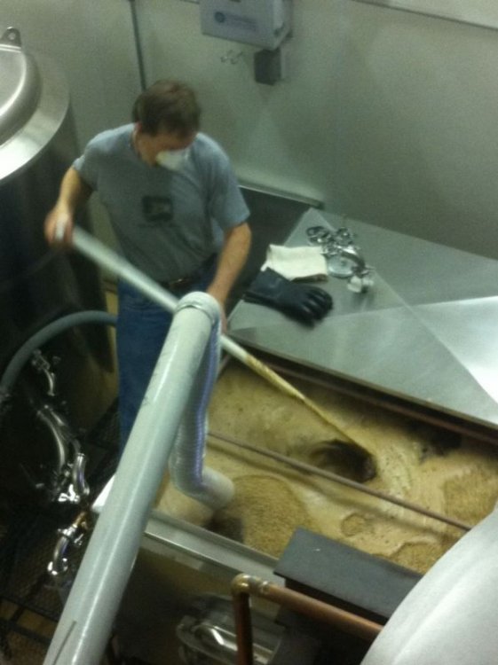 ^ Yeah - brewing is really hard work. After listening to Tom and Lynne talk about it for most of the year, I really wanted to try it out. They currently brew once a week - some weeks they brew twice. Then there are days where they fill growlers, or run the (very manual) bottling machine. And of course they need to run the retail space. It's a boatload of work - but they are having fun. Matt let me know if you need a new shirt, I see Tom and Lynne pretty much every week and it will be trivial to buy a replacement for you. They are constantly bringing me growlers for various people, so it's no problem For part two I'll cover the mash and disposing the used grains.. As soon as Tom gives us the "all clear" from down stairs, we fire up the auger and the grain starts flowing into the mash. I'm having too much fun taking care of the grains in the hopper - making sure everything goes smoothly. As the auger turns and the mash is mixed, the hopper slowly drains. It was quite spectacular to watch - the grains slowly disappear in a sort of slow-motion whirlpool. Meanwhile Tom continues to mix downstairs - never stopped stirring. The wonderful smells have already started to fill the air. Even once the grain hopper is completely empty, Tom keeps stirring. The liquid is already developing the rich, dark colour of an excellent stout - and did I mention that it smells great?! Meanwhile Lynne and I start melting chocolate. Yes - actual melted chocolate goes into the mix! (Although it won't actually be added until the boil, we need to start melting it now). Tom is still mixing, but Lynne and I prepare the hops. The hops have a very strong but very distinct smell - pretty much exactly like an IPA beer. We load up the required amount (by weight) into big bags (like tea-bags) which will be later dropped into the boil. The hops totally disintegrate in the hot water, which is why Tom prefers to keep it all contained in these bags. With the mash sufficently mixed, it's time to strain it and pump it into the boiler. During this process the suds form around the strainer, and it's tradition to scoop up some suds - they taste delicious! As the mash is nearly completely drained, additional hot water is flowed through the grains to help get every last bit of flavor out of them. This hot water flows down from the tanks in the rafters which we filled right at the start of the process (remember?). I previously mentioned that Tom and Lynne built most of the brewery by hand, well the mash tun is an old (significantly modified) dairy tank; it used to store milk. This is looking down into the boiler, as it slowly fills with liquid being pumped out of the mash tun. Taking advantage of the few spare minutes during the transfer, Lynne and I start to prepare the retail area. It's still 5 hours until they officially open, but they never turn anyone away who shows-up wanting to buy some carry-out. Tom and Lynne are amazingly friendly and welcoming, which is a part of their success. With the mash completely drained, Lynne and I start the process of cleaning out the used grains. Meanwhile Tom drops the bags of hops into the boil. That rising steam smelled SO SO SO good! Lynne and I continue to shovel the grains. Almost done now. You can see the line which marked the top of the grains - that was full solid! It took a good 30 minutes to shovel everything out of there. Once Lynne and I had finished that, Tom got to work on the final cleaning and sterilizing. And Lynna and I took all the used grains over to the city compost heap / recycling center. Sometimes Lynne takes this over to local farms so that it can be fed to animals - but being the day before Christmas Eve everyone was busy. Those buckets were *heavy*, and the grains are still very hot. At the compost center we were met by the guy in the bulldozer, and we got to dump the grains directly into the front bucket! You can still see the steam rising...