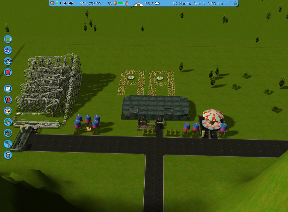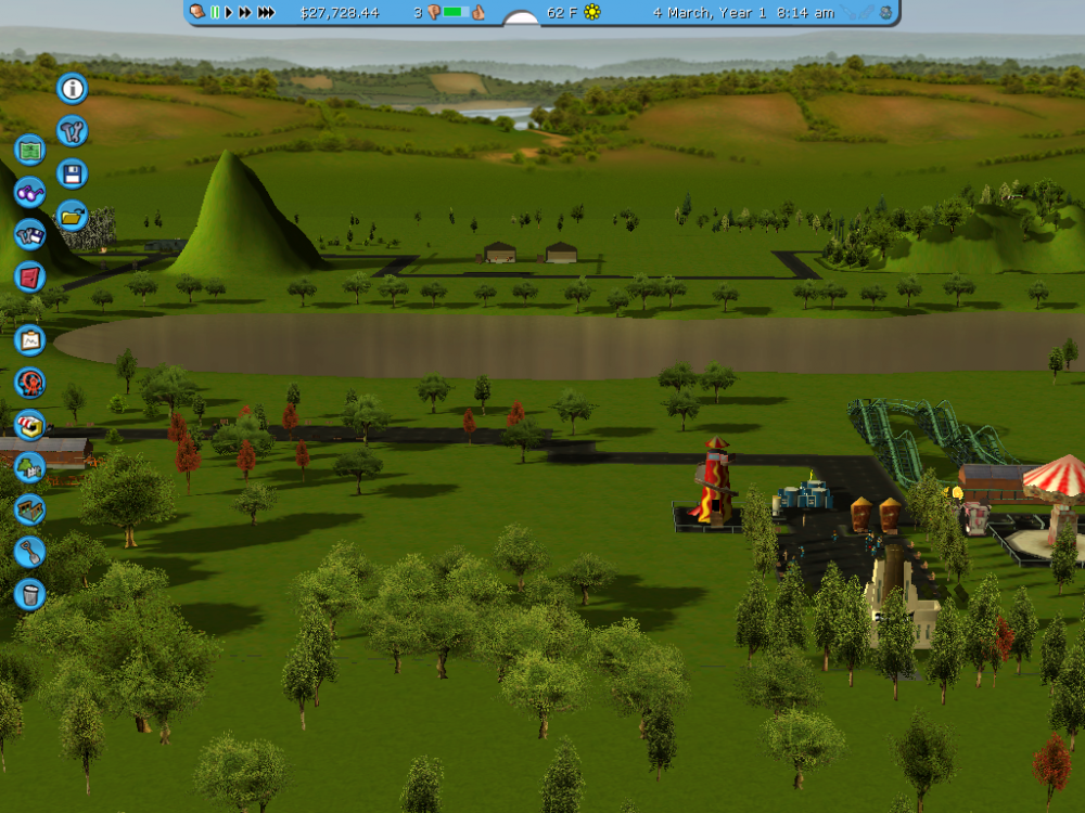 Well, I'm back.....and yes, I've got me another park. And this time I'm going to attempt to do what Frontier Forest is doing right now. Make a timeline park......Only I'll be doing it in RCT3. Why RCT3?, Because I'd like to go one step beyond. Now here's a few things i'm gonna warn you about.... 1. I'm going to start from 1975 all the way up to whenever I get bored. Now since this is 2014, I'll ask the readers that if they want to see the park go on after 2014. 2. My RCT3 skills may be good, but I'm no Hershey's Hawaii. So bear with me ok? 3. There will be quotes from the owner and stuff in my own words. So that's so we'll make sense....Ok so that last sentence made no sense. MOVING ON! 4. I always like feedback. It's what makes a park successful in my opinion, So I'd like to hear about what YOU the people have to say about the park. Be it feedback, an idea, criticism, or even a trip report! 5. Please....don't expect anything consistant out of me. I'm just a 13 year old teen. 6. I will attempt to be as real as possible so....... A. I will start out at $100,000. No real park has infinite money. B. I will only construct coasters that are in said time frame. So don't expect a B&M Giga on 1990. Now let's begin... America's Adventures was first born as a playground in 1952 on a 25x35 pile of unused land by George P. Ruthman. It was a place for kids to have fun while their parents did their stuff. Now why was the name America's Adventures? Well for one thing they were in Colorado, and each day's a whole new adventure there, and second because it was America. Now it was very popular to begin for kids and adults, but soon George P. Ruthman sold his playground to his son Michael T. Ruthman, and he thought big....he thought....What if I could somehow turn this into an family amusement park and yet still keep the ol' charm the playground had?..... Well, he found a way and he decided to call the people from PTC, Anton Schwarzkopf and the world renowned Arrow Dymanics and they starting talking on plans for rides at his new creation.....Of course the town had a restriction. No ride could go beyond 200 feet.... And then......tragedy struck. George P. Ruthman died of a heart attack on July the 1st, 1974. Michael went into mourning and made a solemn vow to continue the success his father had. The owner had thought of keeping a balance between the coasters and the other rides and so he order 4 coasters and 4 flat rides, He asked for a wooden coaster, a wooden wild mouse (the last of it's kind.), a chairswing, a merry go round, a haunted house ride, a slide and two big firsts in amusement park history. The first modern coaster to ever have a loop, and the first ever Corkscrew roller coaster. Now these looping coasters would have a clothoid loop instead of a perfect loop or a teardrop loop like the last two times. Now what was the first step? To keep the playground........BUT....to move it to a new place in Colorado. Now the place was set for the park, and all throughout 1975, the people just kept building and building and building until finally it was ready. The owner has promised a new ride every year to keep interest up. Before..... ...And the day of the grand opening on April 4th, 1976. (Back then, all the landscaping was pretty much complete.) Green Streak, Swingin' Strawberries and The Slide. Corkscrew. Wild Mouse, Haunted Hathaway and Merry-Go-Round. The Petting Zoo. The star coaster of America's Adventures: Viper. The overview of the park. Will the park succeed in it's first year of operation? Until next time folks.