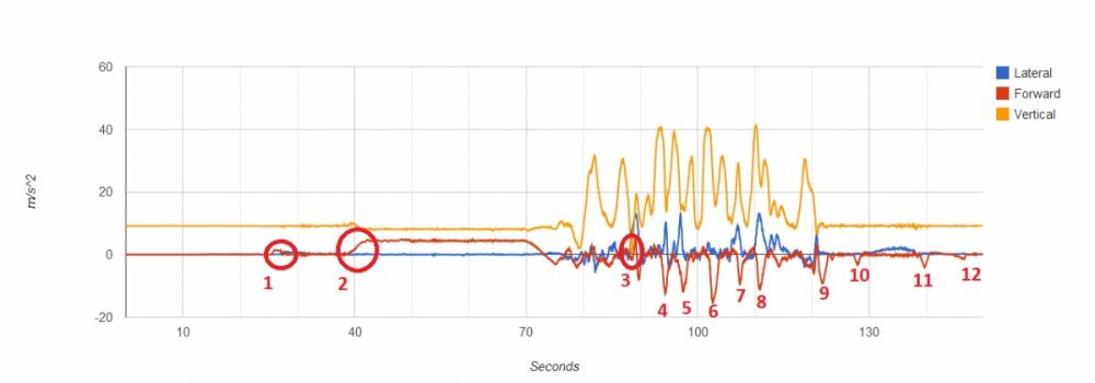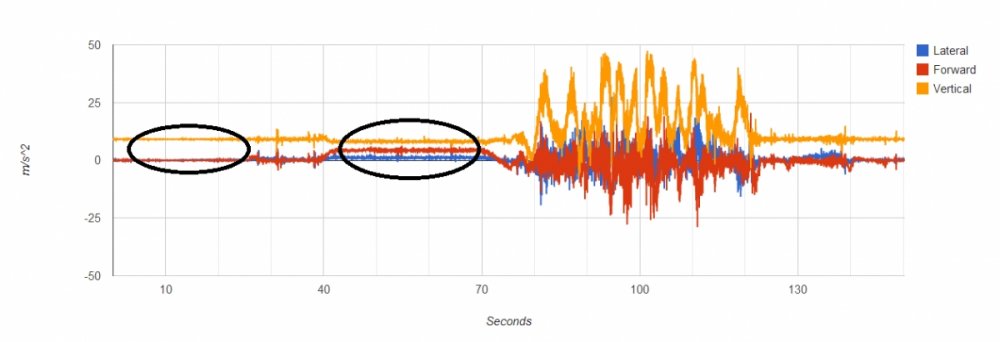 Notice how in some places the vertical acceleration hit a limit at about 40 m/s^2, that is because the sensor in my Nexus 4 has a maximum range of 39.22 m/s^2, that is 4g, with g considered at 9.805