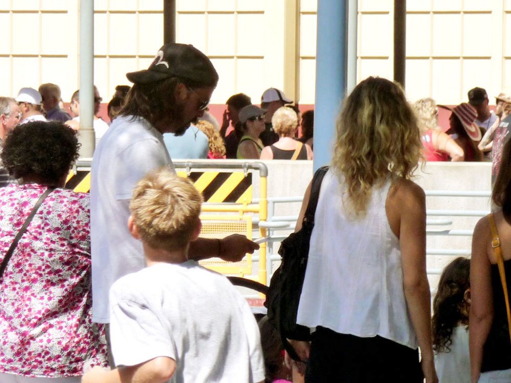 Went to the park today and the crowd wasn't bad but it was more crowded than I would have thought. We were able to get on pretty much all the major rides at both parks. It was my first time riding ghost galaxy and while it was cool it really is a minor change. Racers is fun and I made it on it 4 times. Single rider is the best. It's pretty much exactly what it appears to be from the videos and pictures. One thing I did dislike is the windshield. I found myself trying to look around it most of the time. Being someone that normally wears glasses, I found it to be like looking through dirty smudged up lenses. I'm sure the Test Track windows were the same in that regard but there isn't necessarily anything worth looking at on that ride. About the thrill factor, I actually found it more thrilling than Test Tack. Yes it goes slower, but it has some floater air that Test Track doesn't. The inside line on the banked turns also has a little dip that is kinda fun. After closing... or around closing it broke down and half of the people I went with were stuck on it. We split up because they wanted to watch World of Color and we went on Tower of Terror. While waiting for them to get off the ride, a nice man gave us his "Magical Yellow Cut the Line" piece of paper he got from the ride breaking apparently down earlier. We were able to go up the exit and they let us right into the line at the merge point. It was probably a half hour after park closing before it got going, and there was plenty of people still in line. Didn't go on either of the other Cars rides, but Luigi's looked just as boring as everyone says it is. The line for it was about 60 minutes when we went to look at it, and there was 3 or more empty vehicles, not sure what that was about because they seemed to be floating around just as well as the ones with people in them trying to make them do something. What was funny is that when I was waiting in the single rider for soaring the op counted wrong and when I went inside I didn't have a seat, so I had to go back out. Then I was standing in the pre show staging area all by myself for a while and then Dave Grohl from the Foo Fighters and his family walk in through some other entrance. So that was cool but my group ended up getting split up over 3 shows and that kinda sucked. Here is the ride count for the day. Racers x4 Screamin x2 Tower of Terror x3 Soarin Mermaid Toy Story Star Tours Matterhorn x2 Pirates Haunted Mansion Splash Space Buzz Big Thunder Didn't get a photo with Dave Grohl in line, but I got a creepy over the shoulder shot of him doing what all cool people do, stare at their phone.