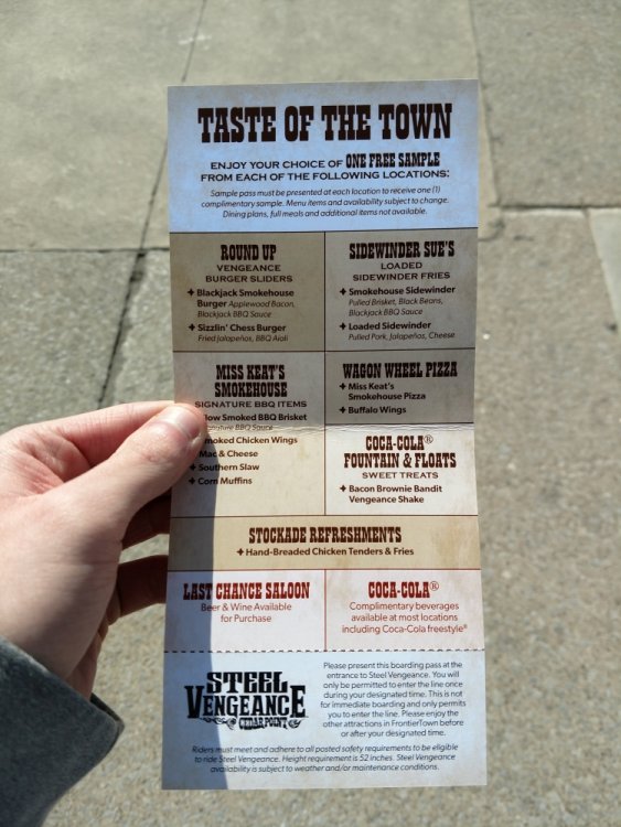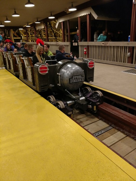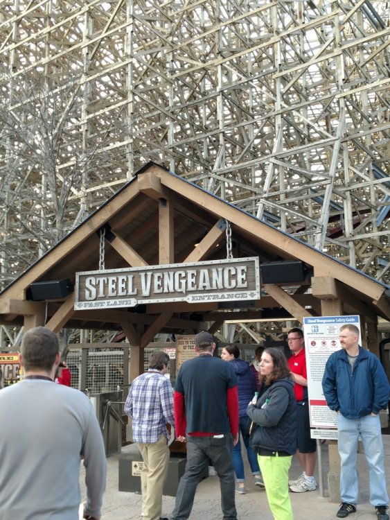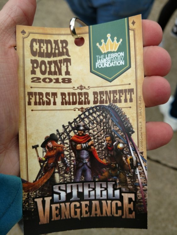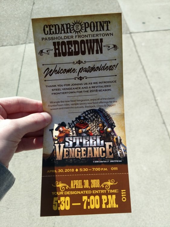 Remember when I said that I would keep up to date and post updates the day of or at least pretty soon after? Well uh that didn't happen. Time to start catching up. This update will be both Steel Vengeance preview events I attended, which were the Steel Vengeance First Rider Benefit and then I chose to do the Passholder Frontiertown Hoedown on Monday. The first rider benefit was Friday, April 27th and it ran from 6-10pm. For $75 you got as many rides on SV as you could fit in plus walk on rides on Maverick and free food which was amazing. I don't exactly remember what I ate but I know it was BBQ and tasted great. Steel Vengeance's opening ceremonies ended at about 7:30 and it was finally time to ride. After waiting in the very reasonable 20 minute line we hopped on. I believe I was in row 4 but I was too much in awe from seeing the ride run then finally stepping into the train to really notice or care. After a year and a half of hype, anticipation, and everything else, it was FINALLY time to ride!!!! We left the station with the Digger character saying something over the PA that helped with the overall moderate but solid theming. Pulling through the transfer bay I felt like I was on Mean Streak again. Plus, with only two trains running, it REALLY felt like Mean Streak! This is where the comparisons end though. Yeah, its the same foot print but wow is it so drastically different. Once you take a right hand turn out of the transfer bay you hit two unassuming airtime hills that give you a little preview of what is to come. Once you climb up the 205ft hill, you are briefly greeted by a great view of the back end of Magnum and the lake up ahead. The look is brief and then you're plummeting down the 90 degree drop straight into a tiny airtime hill that is extreme ejector but still comfortable. That seems to be a common theme with Steel Vengeance. The airtime hills are batpoopoo crazy but still comfortable. I love Storm Chaser but those hills at the end can get a little painful, where Steel Vengeance just doesn't do that to you. After that pop of air you go up the right hand turned top hat that again greets you with great airtime before dropping back down to the ground and then heading straight back up for the right hand outward banked turn. Again more comfortable ejector air (sensing a theme yet?) before heading back down a big drop into a double up into a zero-g inversion that provides fantastic floater air. Heading back over the lift hill you're not really in your seat at all before flying into the flying snake dive or whatever you call it. This inversion has the potential to be jerky or rough but it just isn't. I have no idea how. I guess RMC is just pretty darn good at their job. Heading back downward and then back into another crazy double up you're at the MCBR. The ride rolls through the MCBR without even thinking about slowing down leaving you with only about a second or two to catch your breath, and boy do you need it because to me, the second half of the ride is where Steel Vengeance really shines. The first half is really not much different than most RMCs but the second half takes all those crazy back to back to back to back elements that RMC is known for and puts them on steroids and shoots them at you on rapid fire. It is utterly insane. It just never lets up and seems to go on forever. I'm not gonna outline every detail of the second half but really all you need to know is how relentless this half of the ride is. It really makes you realize that Steel Vengeance is truly out for a vengeance. We hit the brakes (before they broke lol) and the whole train was a mix of laughing, cheers, and what the heck just happened?! So where does it rank? Well for my entire life since I had ridden Millennium, Millennium was my favorite. After getting more and more credits I really only thought Fury to be the only ride to come close to Millennium. Then Steel Vengeance was announced. I knew immediately I had finally found Millennium's replacement. That super high expectation was shattered by Steel Vengeance. I really don't think anybody could go into a ride with expectations as high as I had for Steel Vengeance and they were still not even close to what Steel Vengeance ended up being. New number one for sure and this time I know nothing will beat it. Such an incredible ride. I said screw Maverick and ended up only riding Steel Vengeance that night, finishing with four rides on it, never waiting more than about a half hour. When they are running two trains the line absolutely hauls. Can't wait for two train ops and eventually three train ops. Monday then was supposed to be more to just enjoy frontier town while getting a chance to ride Steel Vengeance once with a boarding pass. Well it turns out my friend wasn't able to stay late enough to use his boarding pass so I got myself a second ride on Steel Vengeance on Monday, along with two rides on Maverick, and one ride each on Skyhawk and Cedar Creek Mine Ride. The food that night was showing off the new offerings in Frontiertown and it was all actually really good. I'm a huge fan of the new Chess burger at Roundup which has fried jalapenos and BBQ aioli sauce on it. So that raps up my report on the Steel Vengeance stuff. This is probably the only report I'll ever write for CP since I'm literally always there but I figured this was all worth mentioning. Hopefully I can get my Coasterstock 2018 report up soon. Until then, Enjoy the Steel Vengeance pictures and thank you for reading! We're here! Wonder why they're here... Ice and Food! Food! More food! There she is. Steel Vengeance is OPEN! First train going up And down they go Happy riders Unassuming but oh so fun. Also of note is the beautiful weather. In April. In Ohio. Gave us this cool souvenir which is a piece of Mean Streak And Monday stuff MORE FOOD!!!!!! And that's it. Thanks for following along! -