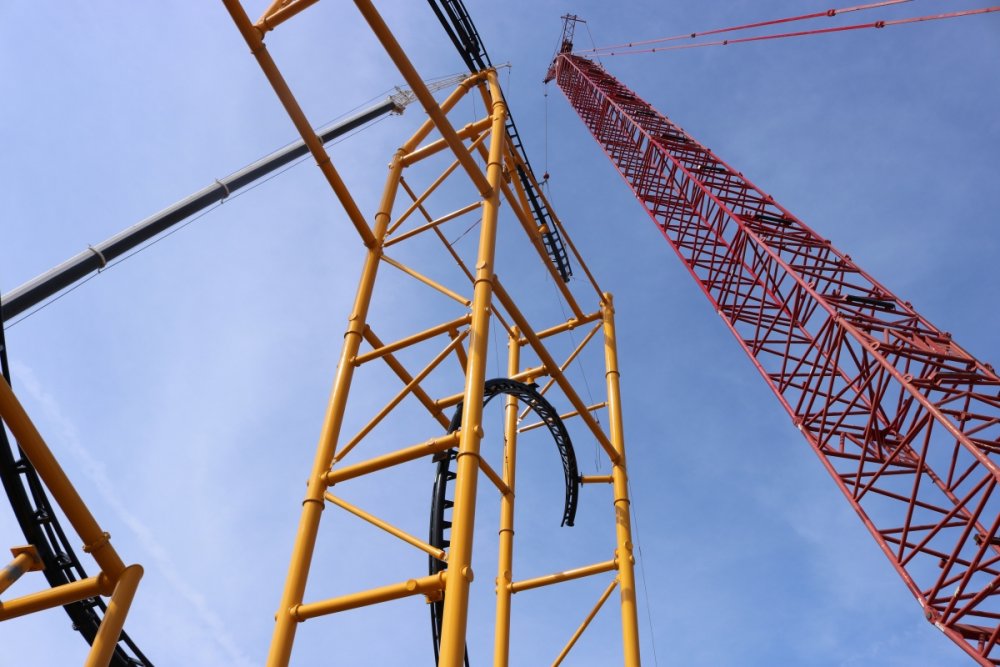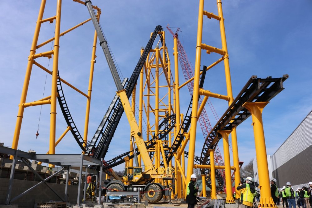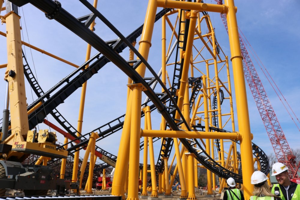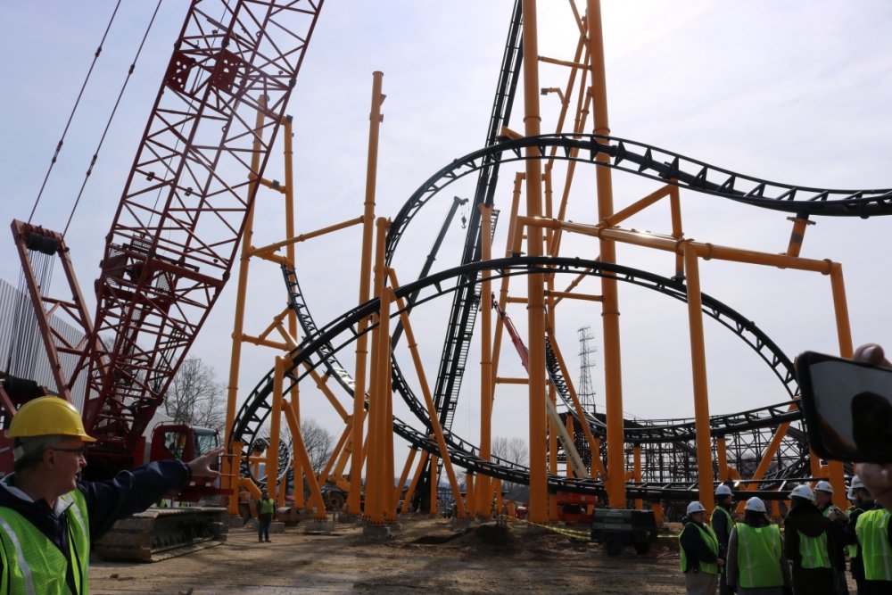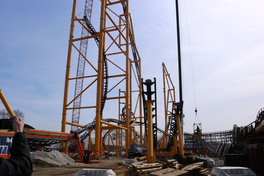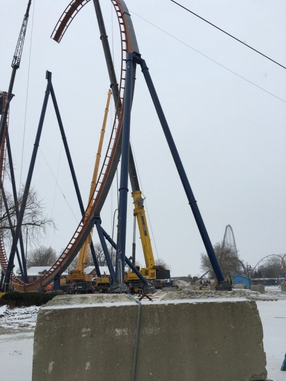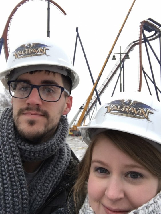 Today Travis and I had the privilege of touring the ValRavn construction site! It was super cold and snowing, and by the end we couldn't feel our fingers and toes, but it was SO worth it! We didn't get much time to ask questions, but here are a few answers from the Project Manager -He said the whole planning process for the ride took a couple years, and they had to consider what layout would fit the area -the ground work for the ride started the day after Labor Day -May 7th is the premiere day -It took 5 cranes to lift the second tallest drop -Testing won't start till the April timeframe Here's some of the pictures and video I took! Enjoy! look at that new skyline <3 I wonder why this road is closed? parts of ValRavn were everywhere! follow the leader! we got to sport these stylish hard hats selfie! Did I mention it was really cold? I love the colors! Looks really nice next to The Raptor really wanted to climb those stairs <3 nerd shot<3 we were lucky enough to see the whole process of the Immelmann inversion being put into place! that new paint job looks so good! ohhh that stuff all looks important... WOW the whole coaster is in this box?! these workers amazed us! a lot of them were working with no gloves and we were bundled up and still couldn't handle the cold! lots of cranes and construction workers everywhere! my favorite thing, an empty park <3 the park looks so different in the off-season …for example there are not usually cars parked everywhere such a great addition to the midway! the size of this ride in person is crazy! the track was supported by these giant concrete blocks! <3 getting closer to putting that next piece in... gotta get that part at the right angle or they have to lower it down and start all over! this whole process took a really long time, there were only 3 other people that braved the cold to watch the Immelmann inversion be put into place getting closer! Ta-Da! worth the wait! watching this whole process up close was a really cool experience! as we left, we said goodbye to the rest of ValRavn This was a really great tour and we really had a ton of fun! I would love to just sit and watch this ride be put together everyday(if it wasn't so cold!) Tony said there were actual company secrets in that bag! Wonder what secrets are hiding in there? going old school with an actual level! -
