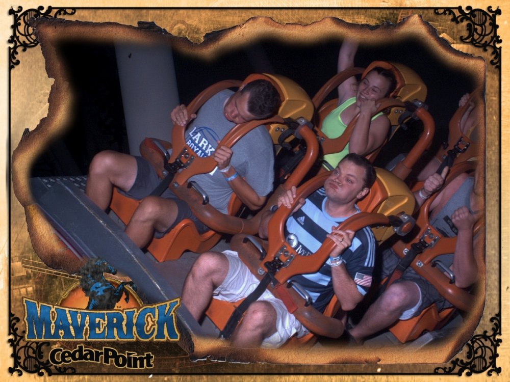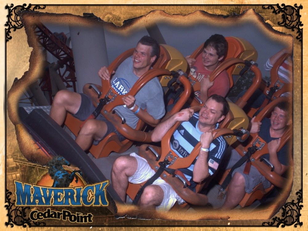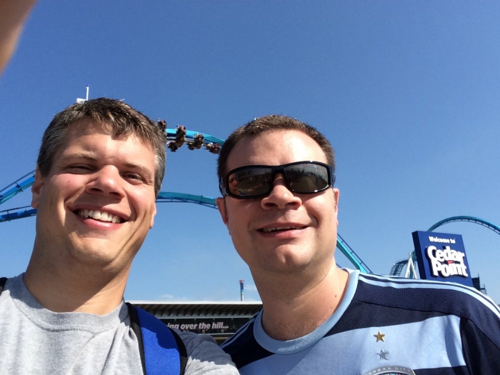 16. ^ Yes it was just the two of us and we loved that we had a small group. Some parks, like Six Flags, make the VIP tours have at least 4 members, but Cedar Fair properties allow as few as 2 people per tour. Part 4: Using Millennium Force as our next foundational coaster, we bypassed Mantis to head to the 300+ ft. behemoth. We opted for the front seat this time, and boy was that great. I did not get a lot of air on the first hill, but did experience my first gray out on a coaster on the overbanked turn after the first drop. That was quite the odd sensation as my vision went really fuzzy and almost pixelated from the overbanked turn through the first part of the tunnel right after. I really liked the pretty good ejector air on the three airtime hills in the front seat. Our first lap in the front of Millennium Force. It was fantastic. After riding MF, I prepared for the pain that was about to commence with the riding of Mantis. I had been one other stand up coaster: Iron Wolf at Great America. I had heard all of the stories about the roughness of Mantis, but I had never ridden it and wanted the credit. I knew from my experience on Iron Wolf that it is imperative to be proactive on the turns rather than reactive to help save your head from getting tossed around like a rag doll. We got locked in in the front row, and I was genuinely surprised at how little room there was left on the belt, but the restraints were as comfortable as a stand up coaster could be. I locked the seat in a little low, so I could stand up without feeling like my manhood would be obliterated. My brother unfortunately was not so lucky and the seat sat a little high for him, which caused a midicum of discomfort, and he complained about a lack of blood flow to his legs by the end of the ride...I’ll just say that I was glad that it wasn’t me. I was pleasantly surprised by Mantis and actually enjoyed it quite a bit and thought it was pretty smooth. I was able to keep my head forward and was able to push it against the restraints on the turns and did not have any head banging. I would have taken a re-ride if the opportunity presented itself, but we had bigger and better things to ride, so it ended up being our only lap on the ride. One last note about Mantis...I was shocked at how loud the ride was. That thing is the definition of B&M roar. It was difficult to carry on a conversation with anyone when Mantis was screaming through its course. We went back to Millennium Force for another front row ride. Still grayed out in the over bank, and it was still freaky to me as I wasn’t sure if the first gray-out was a freak incident. Turns out, that I had a tendency to gray-out on the ride. After we got off the ride, we wanted another ride on MF, but there wasn’t much around there that we wanted to ride right away. We were thirsty, so we asked Mackenzie if we got a drink instead of going on a different ride, would we be able to ride MF again? She indicated that that was fine, so we went and got a beverage in the Red Garter Saloon and heard a little snippet of Rockin’ Country. The little bit we heard sounded good, but we weren’t there to listen to amusement park country, so we headed back to MF for a back row ride. We got much more air time in the back and loved the ride, but we both decided that we preferred the front row. Our second lap in the front, third total on the day. My brother wised up and put on sun glasses to help keep his eyes open throughout the course. For our fourth lap, we opted for the back row. We decided to have a little fun with the picture this time. Not our best effort, but still kind of fun. We had thought that it would be a good time to take our hour break, but thought that we should check the weather forecast. It looked like there might be some rain coming our way around 5 or 6, so we decided to take advantage of the current cloudy, but dry weather and head to Maverick to tackle that ride and the surrounding credits. We had already ridden in the back of the train, and my brother had never ridden in the front seat, so that is where we headed. I’m usually a hands up coaster rider, but Maverick is not that type of ride for me. I eventually found a good brace position where I pushed my hands against the lower part of the over the shoulder restraints. My brother opted for a hands on the top of the restraints, which helped, but still threw him around a bit. First lap on Maverick in the front for my brother, but second lap on it for the day. I looooove this ride. The quick changes, the ejector air, the launch, the floating air in the horse shoe roll...All of it makes for an excellent ride. After our second lap on Maverick for the day, we headed over to Skyhawk. I had been on one S&S Screamin’ Swing at Silver Dollar City and loved it, so I was excited for my brother to experience these swings on steroids. I’m not sure he really knew what to expect, but both of us loved the ride. You get some great negative g’s in the ride, and it is really freaky to go past horizontal and look straight down at the pavement below. Unfortunately, this ride was involved in an accident about 7 hours after we rode it, and this was the first time an amusement park ride had an issue so close to me riding it. It seems like Skyhawk has had several issues, so I hope they can get everything worked out, because these S&S Screamin’ Swings are a blast. The exit/VIP entrance for Cedar Creek Mine ride is right next to the exit of Skyhawk, so we took that opportunity to get that coaster credit for the day. I had been on it in 2011 and remembered I thought it was awful then, but it was the first time my brother had ridden the coaster. Both of us hated the ride. It was rough, boring, and pretty much the worst coaster in the park. After the pain that was Cedar Creek Mine Ride, we headed to Maverick again. After riding in the front row, we established that we would only ride Maverick in the front row for the rest of the day. Very si