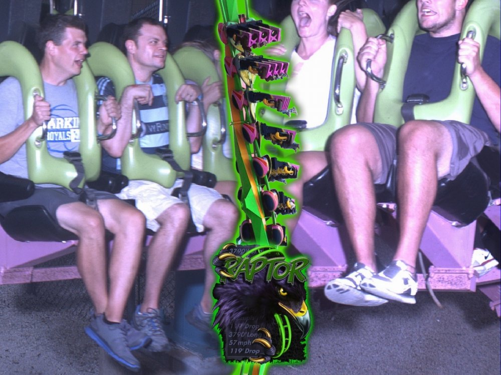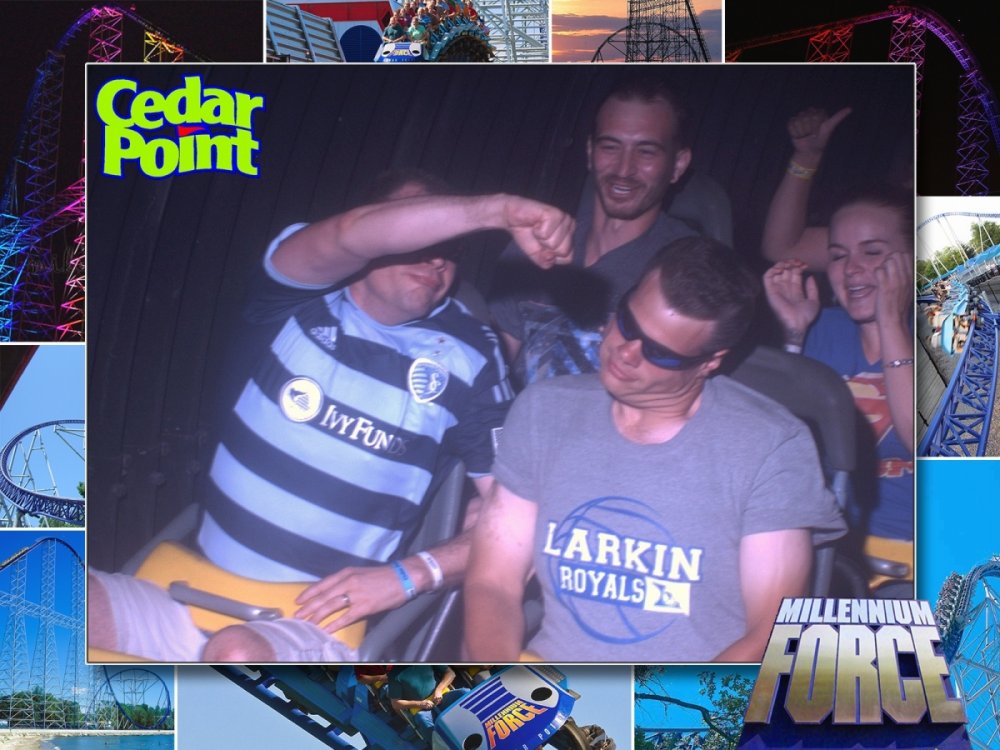 12. Part 6: At this point, we had completed our lap around the park and it was time to ride TTD, Millennium Force, and Maverick as much as we could. We were already by TTD, so we decided to ride that, then make our way back to Maverick and stop by Millennium Force on the way. We got to the station of TTD and took our seats in the front row and pulled ahead into the loading station. As our train loaded, the train ahead of us on the track prepared to launch. The engine noise rumbled...the train shuffled back onto the launch cable...and then they waited…and waited. Eventually the engine noise shut off as well. Top Thrill Dragster was down. The ride ops on the microphone asked everyone at the air gates to move back two steps, then those of us on the train were instructed to to get off the train and move back into the air-gates. Being on the VIP tour we weren’t entirely sure what to do, so we did as we were instructed and got behind the air gate. We asked the ride op by the front row and told her our situation, and she didn’t really know what to do. This was the second time it was nice to have Mackenzie be our advocate while we were on the tour. At this point my brother and I see Mackenzie walking up to the front of the station from the exit, and she talked to a few ride ops in effort to get us out of the air gates. The ride ops were in the process of moving all of the empty trains back a spot on the brake run to allow for the train ahead of us to come back to the station to unload. My brother and I really had no interest in waiting, as time stuck in the line was valuable time that we could be using to ride other rides. Thankfully, after talking to Mackenzie, the ride ops opened the air gates so my brother and I could exit the ride and continue our tour. After our short and ineffective attempt to ride TTD, we headed over for another ride on Millennium Force. Again we chose to ride in the front seat. We definitely established a preference to the front seat on this ride. I still grayed out on the overbank, but still really enjoyed the ride. After the first hill after the overbank, both my brother and I felt a tiny pin smack against our hands. At first we thought it was just the gnats that we had heard about, but it was a little too frequent to be bugs. Unfortunately, we realized that rain had started to fall. We were disappointed as a few more drops hit us on the brake run waiting to unload. Maybe our luck had run out, and we were done riding for the day. While we would have been mildly disappointed if the rides closed due to rain, we had accomplished everything we wanted and knew we had already lucked out with the weather. By the way, while the rain was the cause for most of the pins we felt on the ride, we did hit quite a few bugs...that was a new experience for both of us. Oddly enough, not as gross as I thought it would have been. I finally jumped on the sunglasses bandwagon. They really do help keep your eyes from watering too much, plus they protect your eyes from the wonderful protein splatter of dead bugs. Win/win in my books. By the time we got off Millennium Force, the precipitation had seemed to stop, so we headed back to Maverick to get on that a couple more times. This being our 5th lap on Maverick, we had both pretty much perfected our hand position for a painless ride on my favorite steel coaster I have ridden. We went to get our picture emailed to us, but there was a line so we opted to not get the picture. We knew we wanted to ride Maverick and Millennium Force again, so we thought about riding Skyhawk again, but decided to ride the Antique Cars in order to ride Maverick again with minimal walking. Whilst on the Antique Cars, I noticed that TTD was running again. I was excited that we might get one more lap on it before our tour was over. By the time we got off the Antique Cars, the time was 7:30. We talked to Mackenzie and asked if she thought it would be possible to ride Maverick, Millennium Force, and TTD one more time before our tour ended at 8. She replied that even if we didn’t get over to TTD by 8, she would make sure that we got on it again because she was a bit late to begin the tour. This was another moment where we would have been fine with whatever she said, but it was really nice that she went past her time to make sure that we had a great experience. Knowing that we had our last three rides lined up and a verbal confirmation that we would ride them, we were able to walk a little slower and be a little more leisurely at the end of the tour. We hit up Maverick one last time. And loved it yet again. After getting our last Maverick picture, we headed over to Millennium Force for our last lap on that. In effort to prevent the gray outs I had been experiencing, I tried a technique that I remembered hearing about from fighter pilots on TV shows when they fly with non-pilots to help not pass out. I remembered them telling the passengers to squeeze their butt cheeks to keep the blood from rushing out of the head. Apparently the technique worked well enough because I did not gray out on our last lap. However, the bugs had intensified since our last ride. In some weird way, the bug splatter on our shirts was kind of funny and almost like a badge of honor. I did not mind the bugs as much as I thought I would. I tried having a little fun with the on-ride photo. Not great, but not terrible either. I wish I would have tilted the other way for better viewing, but oh well... Our last lap on Millennium Force. We tried to go for the gusto and have another gimmicky picture...and it sort of worked. I think my brother was genuinely frightened that he might hit me, so he over compensated a bit. It's still a fun picture though. Once we had wiped the bug remnants off our hands and shirts we made our way to TTD for our last ride of the tour. Yet again, we walked up the exit and sat right in the first row. I loved the ride the last time as much as the first time. It is such a great 