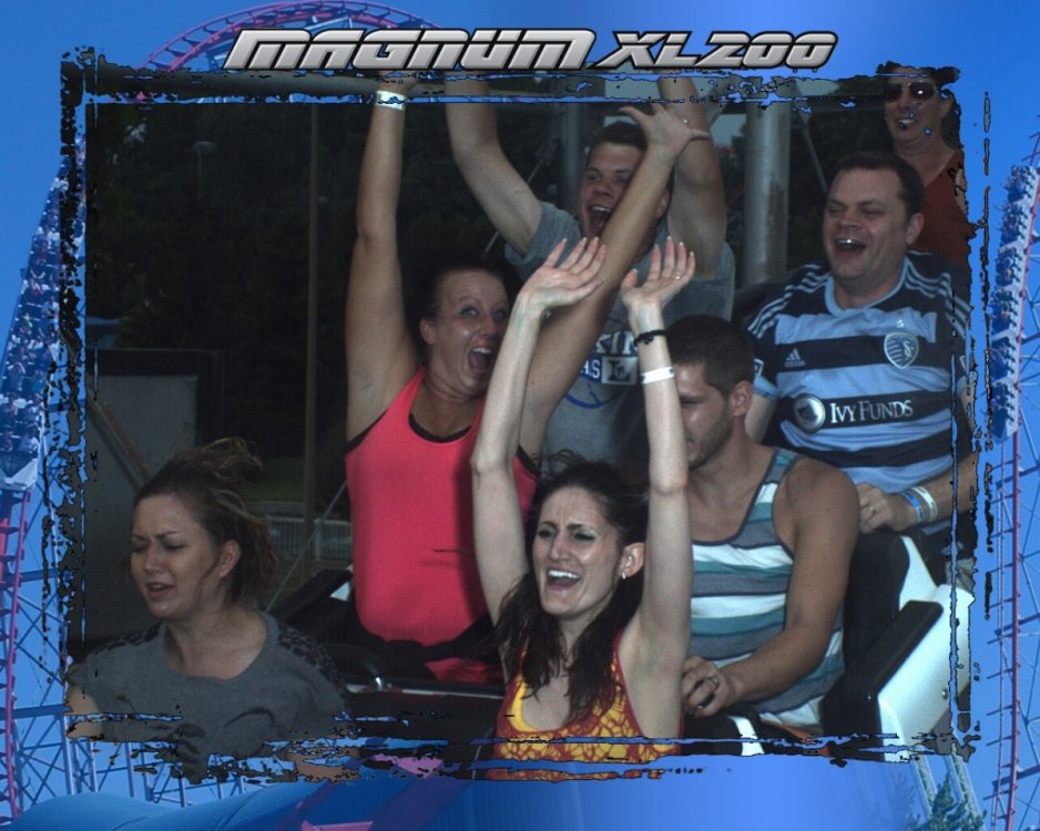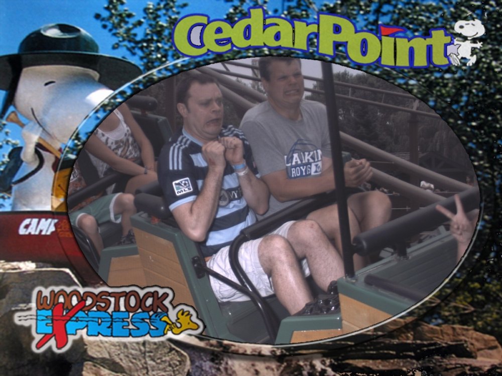 15. Part 5: After our impromptu and fortunate tweetup awesomeness, my brother and I headed over to the newly renovated Gemini midway to wait for Mackenzie. We both had fleeting thoughts of seeing if we could ride something in the 20 minutes we had left before Mackenzie was finished with her break, but we quickly decided that sitting felt great, and we did not want to stand in a line. So we sat down and watched several people ride Slingshot, which was enjoyable. Right at 5:30, Mackenzie strolled up the midway, and we walked right onto Gemini. I had fond memories of Gemini from my last two visits. I remembered it being really smooth and having some great air time. We got in the back seat of the Red Train, and we were off with a modicum of excitement...it is an Arrow after all. We had planned on riding both sides, but after the first couple hills we realized that once was going to be enough. It was another pretty rough and painful ride. It might have been better in the middle of the train, but we did not care enough to try it again. I was disappointed that Gemini did not live up to my expectations. Once we were done with Gemini, we walked down the new midway to Pipe Scream. Like several rides at Cedar Point, I had ridden a similar ride, Surf Dog, at Kings Island and was underwhelmed by my experience. I was pleasantly surprised by Pipe Scream. We were in the back row all the way on the right side. Pipe Scream felt a lot faster and more forceful to me than Surf Dog. It’s a great addition to that part of the park. Once off the ride, we crossed the midway and hopped on Lake Erie Eagles. It was my brother’s first experience on flying scooters, and we both had a blast. It is really fun to be able to control your own vehicle and get it going as high as you can. One note about the Lake Erie Eagles: it has terrible capacity. The ride takes forever to slow down, and there are only 8 vehicles. I am kind of surprised that Cedar Point did not put two flying scooters next to each other to help with the capacity. At this point, we had three coasters that we had not ridden on our big lap around the park. I asked at the beginning of the tour if being a VIP would help me get on Wilderness Run (formerly Jr. Gemini) although we did not have anyone between 36” and 54” to ride with me. Mackenzie said that she couldn’t help with that, so I knew that I would not be able to get on all 17 coasters in the park. Oh well. We had two coasters left that we could ride, so we walked back across the midway to Camp Snoopy to ride Woodstock Express. It is an average Vekoma roller skater, but it was a credit that I did not have, so we needed to ride it. We also decided that this would be a great coaster to get our hard copy photo that we get as part of the VIP tour. This picture would join two other pictures of my brother’s son on our previous trips to Cedar Point, so it will fit nicely in that regard. Apparently the ride ops at Woodstock Express were not used to VIP tours coming through, because they had this confused look when we walked up the exit and Mackenzie asked for one row on the next train. It ended up not being a problem, but it was kind of funny none the less. Because we wanted this to be our printed picture, we knew we had to be in the same car. We knew it was going to be a tight fit, but we were both very surprised at how tight the seat belts were on the ride. There were two groups of riders that had to get off the ride because the child was not tall enough to ride by themselves and their parent was too big for the safety belt. I’m surprised that Cedar Point had individual seat belts that were so small on a family coasters. Seems like a large oversight on their part that makes their park slightly less family friendly. Our "terrifying" ride on Woodstock Express. We had fun and got several chuckles from the people waiting in line as we were two grown men sitting in the same seat. We survived our cramped ride on Woodstock Express and headed to our last credit for the day, Magnum XL-200. Both my brother and I have ridden it before, and it is not our favorite ride by any means. We pretty much tolerate it to get the ride credit on it each visit. Prior to our trip, I asked on the TPR boards for favorite seats on different rides and the overwhelming consensus was that we needed to ride Magnum in the “ejector seat” which is the 3rd row of the front car. We walked up to the station and Mackenzie instinctually asked for the front row, and I quickly interjected with the recommended seat. After hearing our seat request, the ride op on the station gave this nod of approval showing that we had either chosen really well...or really poorly depending on how you look at it. The ride was everything we were expecting. The first drop is fun, and that is about it. I absolutely loathe the beginning of the turnaround. Well before you start the turn, the track pitches hard to the left and it throws you out of your seats in the most uncomfortable manner. That was back in the era when it seemed like Arrow just sort of hoped they got the physics right. In this case, Arrow guessed wrong. The bunny hills on the return were equal parts fun and painful because of the ejector air you achieve. All in all it was what we expected. Oh, the pain...I do love how the on-ride photo is positioned to take a picture at one of Magnum's most painful moments.
