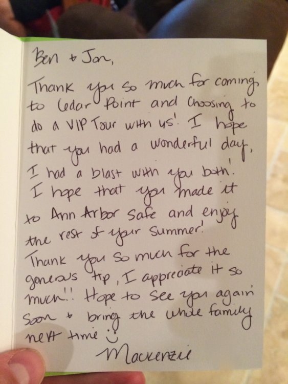 8. Congrats if you read all of the posts I've submitted thus far...it was a lot of words. I have one last little bit with a review of the VIP Tour and any changes I would recommend and such. Part 7: A bit about the actual VIP tour: it is not cheap. It is not designed to be cheap. It is a luxury service that the park offers, and for us in our situation, it was worth every penny. Our decision to take a VIP tour was mostly as a celebration but also to experience some of the best coasters in the world in a special way, and the VIP tour accomplished all of that. Neither my brother and I are rolling in money (he’s an associate attorney, and I am a public school teacher), but we made this a priority to do this summer, and the VIP tour was everything we hoped it would be. In my opinion, the tour is totally worth it if you are celebrating an occasion like we did, saved up for a very special event, or have a crap load of disposable income. This will not be an every year event for us, but we had such a great time that my brother, his wife, and I are already thinking about taking another tour in a couple years if we can make the timing and finances work. In my opinion there are good ways to do a VIP tour and some bad ways. Mackenzie told us that before our group, only 2 of her 27 tours stayed until the end of the tour. Maybe we were naive and stupid, but there was no way that we were not going to take advantage of the full time that we were allowed. We were exhausted by the time the tour was done, but had a blast the whole time and could not imagine leaving early. She also mentioned one group that spent an hour and a half in Camp Snoopy. To me, that is a complete waste of what a VIP tour offers. I will also say that I would not want to take a tour with more than 4 people. My brother and I mentioned that 2 was a great number because our desires aligned almost every time, but with more people, you have more ideas of what everyone wants to do. Plus with 2, you never have to fight over who gets the front row every time. I mentioned it before, but I’ll mention it again, Mackenzie was awesome. She was our advocate when we needed an advocate. She kept up with us all day and had a smile the entire time. Every time I handed her my bag to get on a ride, she would say “Enjoy your ride!” It is small stuff like that that makes an impact and makes you feel special. She was very personable, engaging, and a great fit for our group, which is not surprising given what her responsibilities are as a VIP tour guide, but it was still appreciated. She was a big part of why our day was so special and fantastic. One last thing about Mackenzie: On August 1st, 6 days after our tour, my brother received a handwritten thank you note from Mackenzie to both of us. We were both totally impressed that she would take the time to write a thank you note especially with such a personalized touch. In retrospect, I have a feeling that she does this for all of her tours, but it does not make it any less awesome. It was just another way that Mackenzie and Cedar Point got so many small details correct that made us feel so special throughout the day and after. This is the Thank You note that Mackenzie sent my brother and I about a week after our tour. I typically hate Thank You notes and think that they are unnecessary and archaic, but I actually was surprised by this one, and may help change my opinion on Thank You notes. If I could change a couple things about the VIP tour, I would include the All Day Photopass instead of the singular hard copy on-ride photo, or at least offer the option to choose one or the other. I would also allow VIP tours to have any food item at any non-chain food establishment. I’m not asking for free Panda Express, TGI Fridays, or Famous Daves, but I think that any park-owned restaurant or food kiosk should be open to the VIP’s to use if they so choose. In some ways I also wish it was a bit longer, but with the knowledge that only a handful of groups make it the whole time, I can understand why they cap it at 8 total hours. Other small changes I might recommend: it would be nice if the VIP tours included a Fast Lane + for members if they wanted one after the tour was finished. A small discount on in-park merchandise would have also been appreciated. They also advertise special seating to shows in the park, but Luminosity is not included in that, so the inclusion of VIP seating for Luminosity would be nice as well. The lack of those things did not take away from our experience, but I think that including them would make the VIP tours even better.