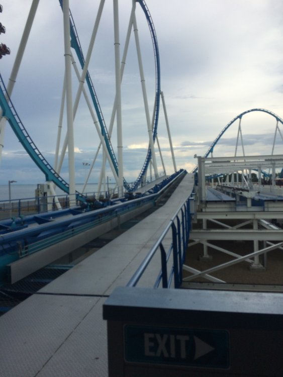 I just noticed you can see my shadow in the 6th picture. You'll also be able to see some MORE NEW PICTURES!!! I want this to become a recurring theme in my trip reports And another Top Thrill Dragster picture But we went to Mean Streak! We had unofficial assigned seats on Mean Streak. I was car lastcar, row 1, left side. If it was bad there I wouldn't have ridden it again. And we pause the roller coasters for a show at Palace Theater It was a pretty swell show This park has so much Ominous clouds approach That storm passed. There wasn't that much to it but at Cedar Point it's enough to bring a lot of stuff down But it's not over yet. The rest didn't begin yet Raptor was a walk on for every row but the fron But we took an exception to the rule because Cedar Point knows how to run rides efficiently. Night time begins on our final day at Cedar Point The park was so empty I finally got on Windseeker There was a beach party going on so why not? I'm starting to think 2 days isn't enough to fully experience Cedar Point Last ride on Top Thrill Dragster? No it broke down and we were short on time Last ride on Mean Streak? No because I decided to wait for the front because I wanted to see how much better it would be if I sat in the front and leaned forwards like coasterbill always says. I sat down in the seat. I SAT DOWN! And some noise starts to noise. Then dots start to appear on the track. It was raining! So they kick us off the train and since we had to get to Millennium Force we had to leave the ride. They were only running one train, so if they ran both I would have been on. After some intense Millennium Force riding, it's time to leave. Goodbye Cedar Point AAaaand it's the next day and the drive to East-Central Pennsylvania begins. I'm tempted to move here but living in Ohio is a subject of many jokes. -