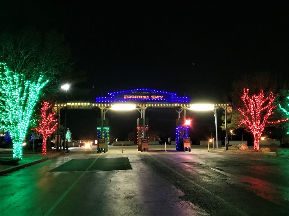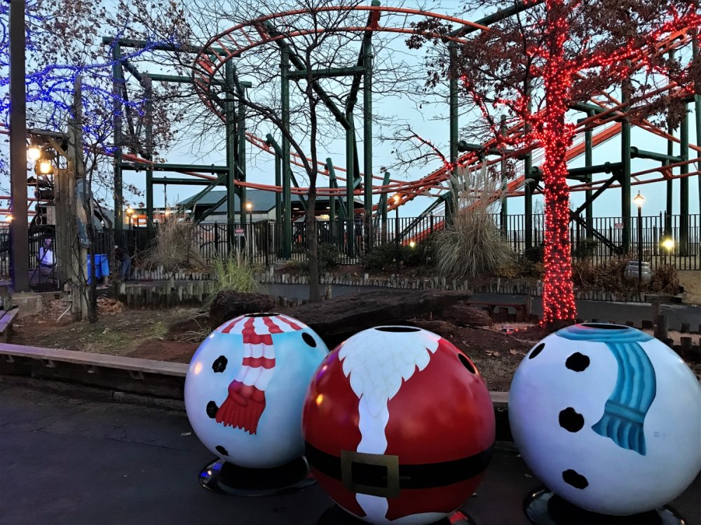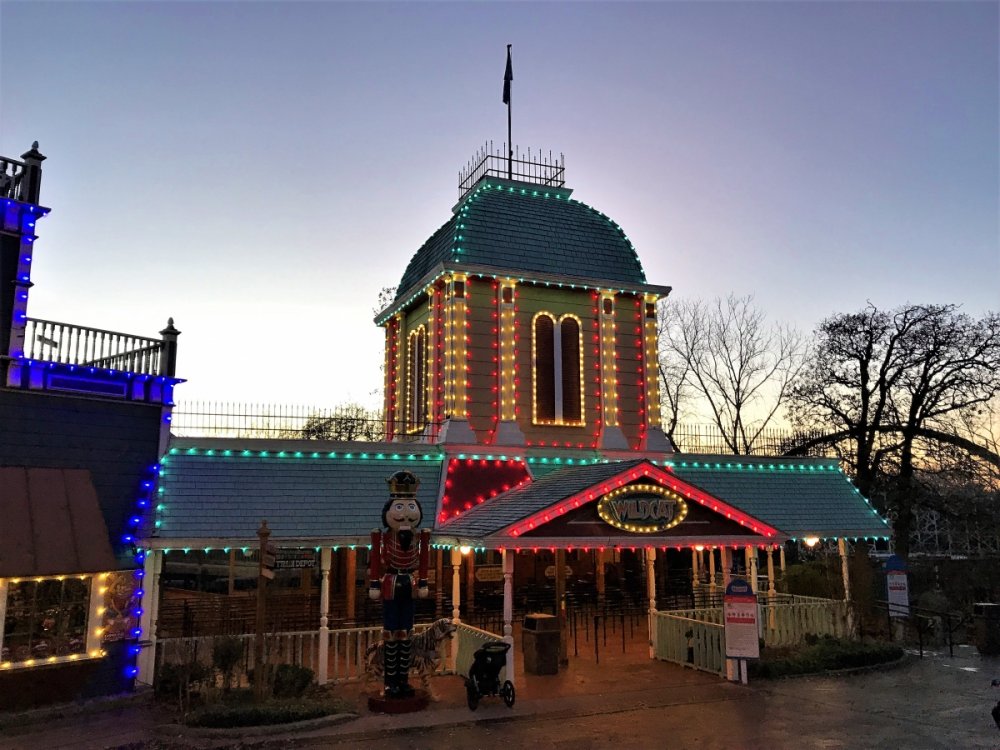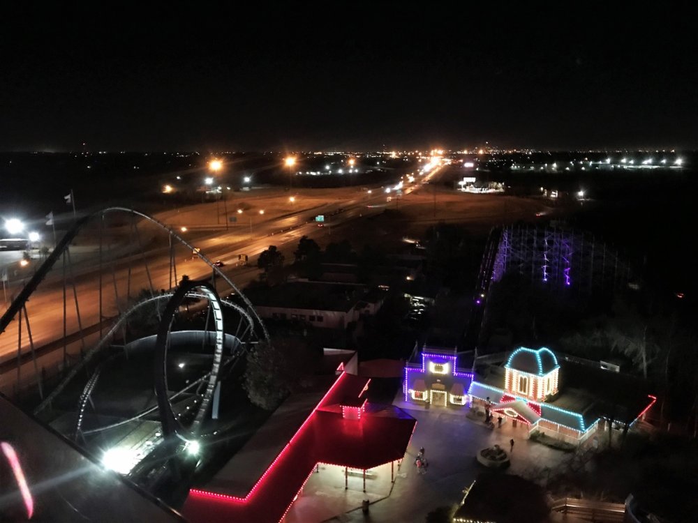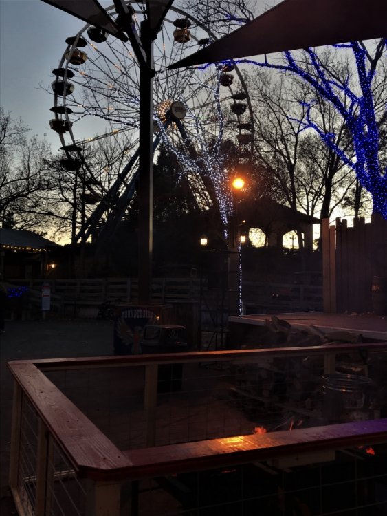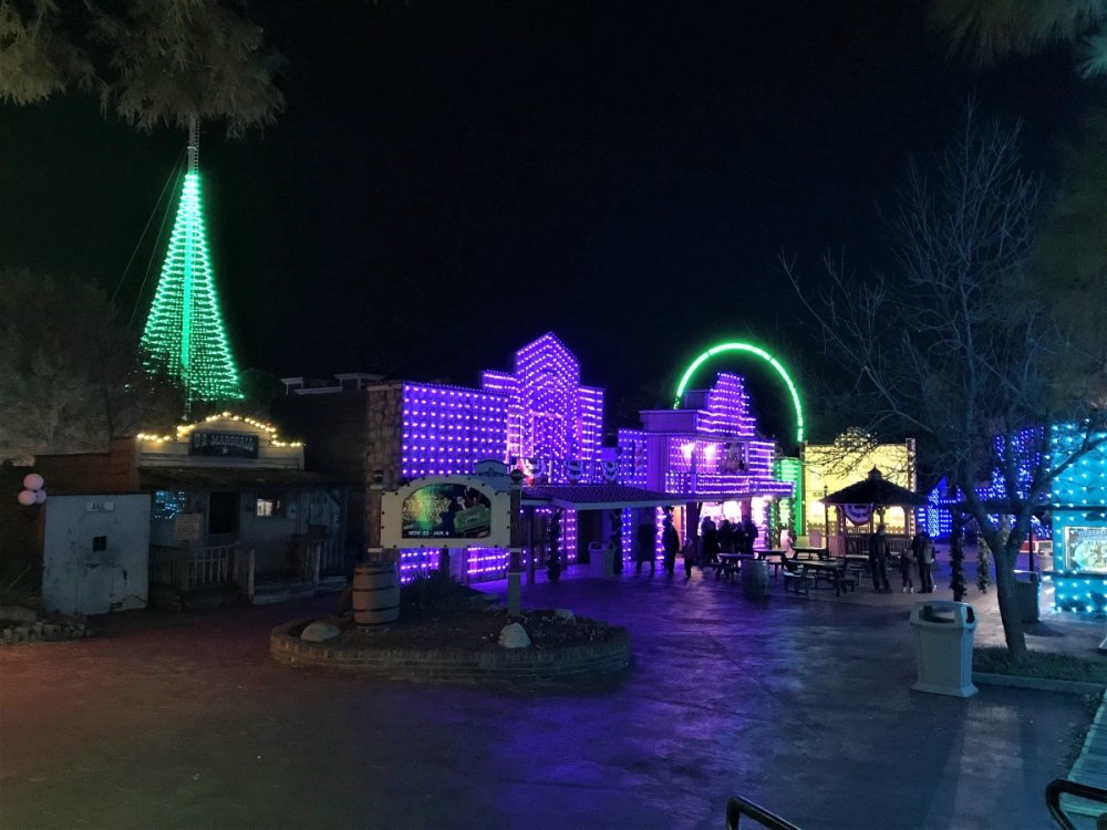 I visited Frontier City for Holiday in the Park last Friday. The park was truly amazing for the parks very first Christmas event. I was surprised how much they had decorated in 3 weeks. They even had some interesting and fun surprise Holiday Easter eggs. Like Quick Draw I would give that Sally shooting dark ride a whirl they cleverly decorated the inside the ride. They did close off their "Renegade Road" which is where you would find Renegade Rapids, Sidewinder, Gunslinger, Go Karts and the Gunfighter stun show. That area has been decorated with lighted scenery's, lighted Archways and a lighted tunnel. They now call the area the North Pole . The Ferris Wheel will take you up and over the park to get sweeping views of all the lights. Soaring Eagle another attraction this will take you over the lighted Main Street and the main Christmas Tree. Another area to get sweeping views of the park Diamondbacks Launch station. The parks has a few shows Magic of Christmas a Christmas themed magic show and Best Time of the Year. Carolers roam the park singing classics. They like it when you join in with them and are very interactive with guests. They like to take selfies with you. Also Main Street is decked out in a Dazzling light shows with snow cannons. The show plays every half hour till the park closes. Kids have a craft area to write Santa a letter and decorate cookies. Of course you can get your photo taken with Santa. Like all Six Flag Parks there is 3 fire pit areas to make s'mores. Your normal Christmas food items Hot Chocolate, Christmas themed Funnel cakes, cookies and bread bowls. Here are some photo I taken when I was at Frontier City for their opening night of Holiday in the Park. -