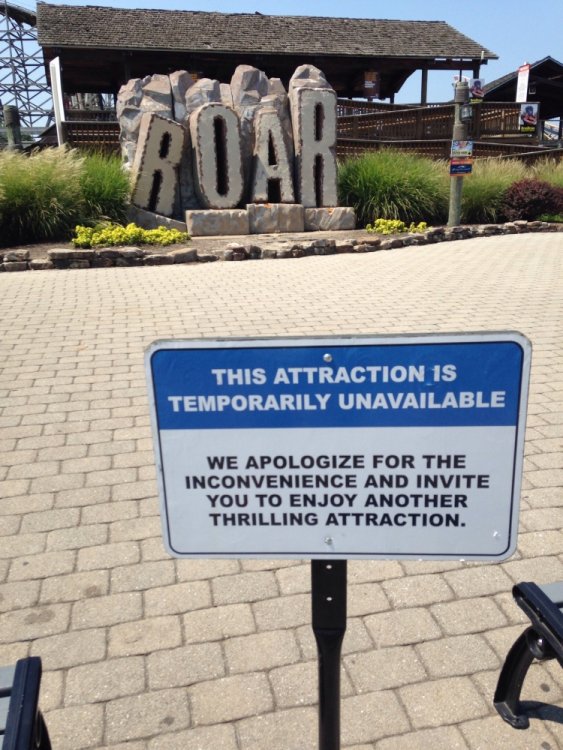 Roar Has a sign stating it closure with 2 trash cans and 2 benches to block the pathway to the ride. -