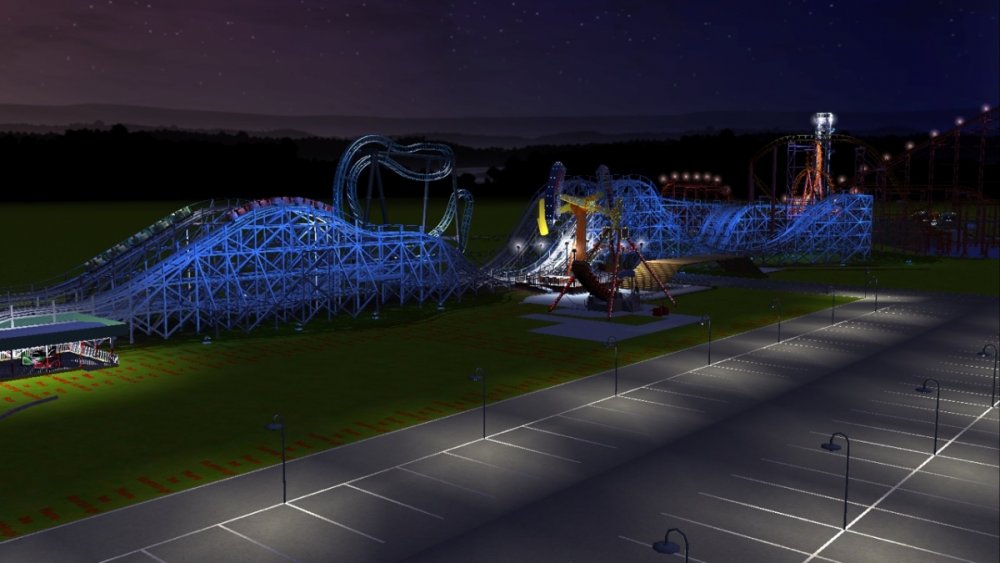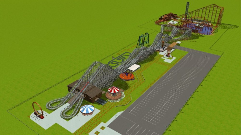 This is Sandcastle Park, a seaside park inspired by Santa Cruz Beach Boardwalk and Coney Island. Yes, I know there is no ocean near my seaside park. It will run alongside the park, but I don't plan to put the park on a boardwalk, just to have the ocean across the street from the park, a la Luna Park. The major coasters and layout of the park are done for the most part, but I still need to fill in the gaps with more flats and some carny games. I also would like to have a dark ride, preferably a Laff in the Dark, but I have no idea how I would go about theming one and what CS to use. Please let me know what you think of the park! An overview of Sandcastle Park, in all its WIP glory. I like night shots. Thanks for reading, and please leave feedback! The park's signature ride is the Racer, a woodie built in-house by park staff. This coaster differs from the PTC racers in that the two lift hills are separated and the return runs are close together, leading to a more dramatic finish. My dark ride. A park like this really isn't complete without a dark ride, so I'd really like this one to be great. Can anyone recommend some dark ride sets, or give some tips? The midway and parking lot. Here you can see that the parking lot entrance has the cars driving under the Racer's structure. The back of the park feels more permanent, and will get trees and minimal theming eventually. This is Fire Bird, a large Arrow looper with interlocking loops. It interacts with the lake and many of the flats. Like all seaside parks, Sandcastle Park looks better at night. The Racer is lit up blue, making it a little creepy looking.