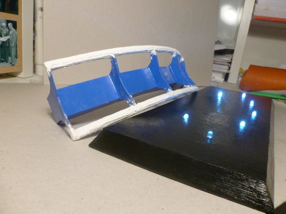 4. I agree with you, the light highlights the model, and it's one of my favorite stages ! That's right, the base is hollow ! But it's just made of cardboard and glue. I hesitated to add wood to make it more solid, but when I finished the base, I saw that it was very rigid so that was enough. After paste it in the middle of the base, I dove the rails in the plaster. But you're right wee can clearly see brush marks, but that's not wood one pic to be more persuasive:
