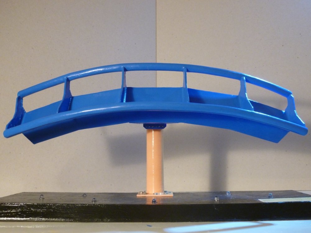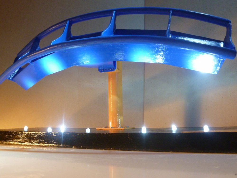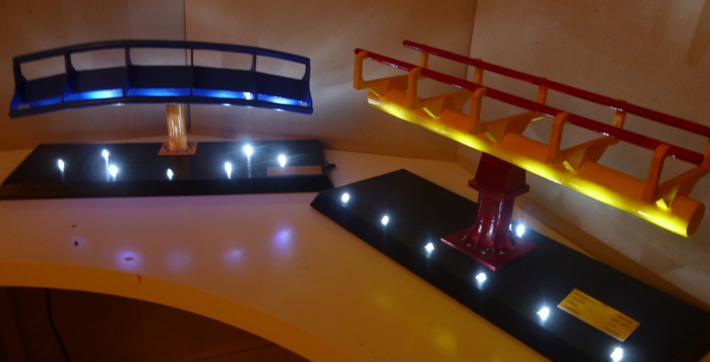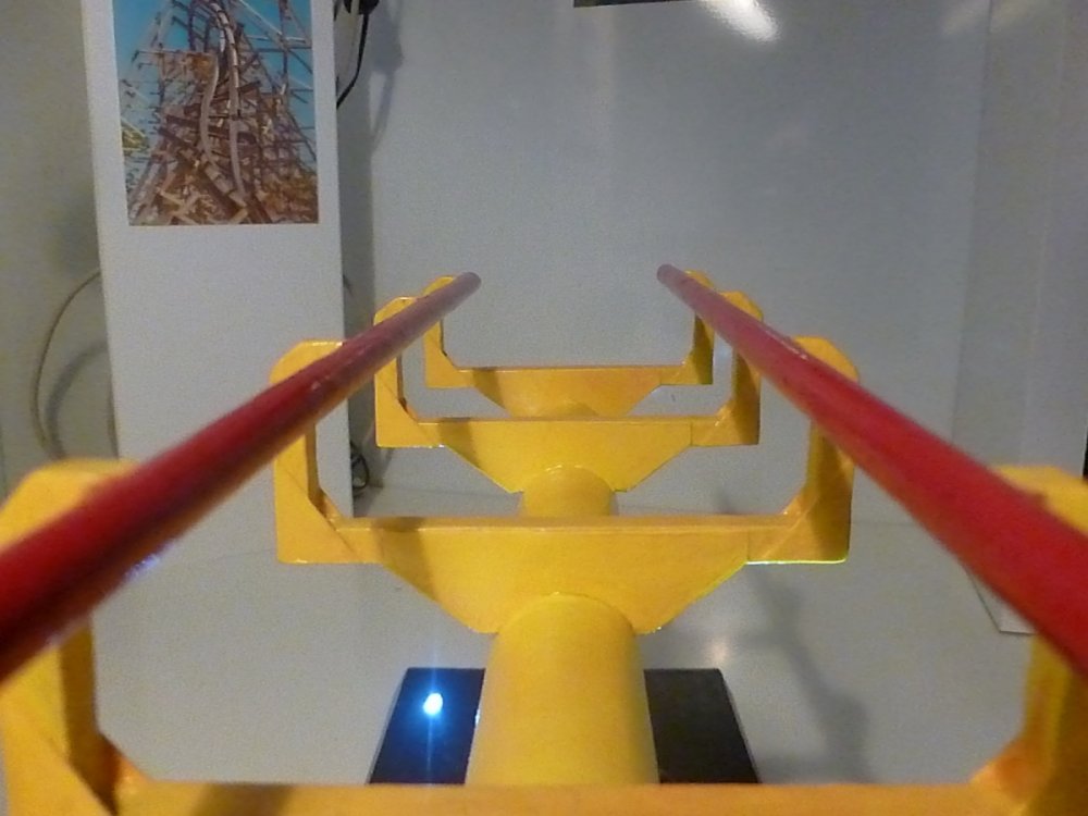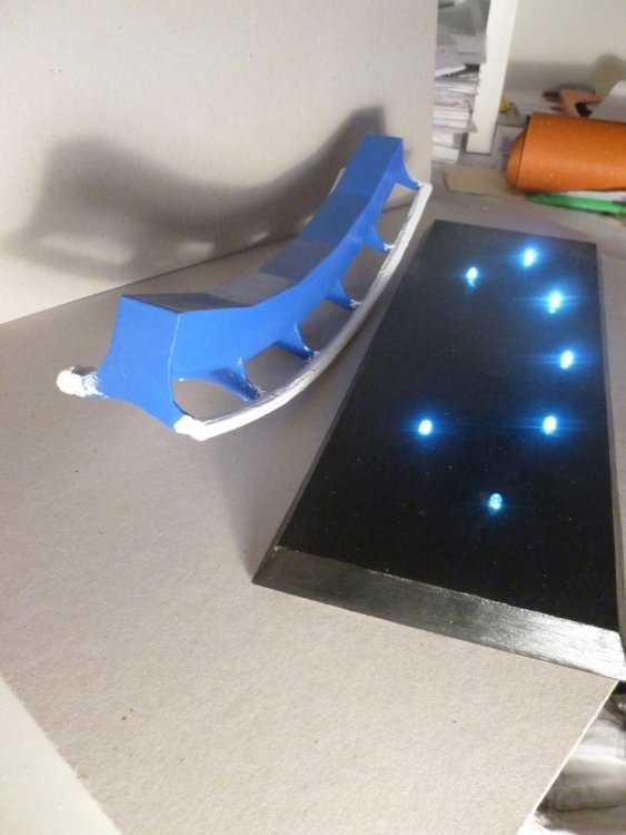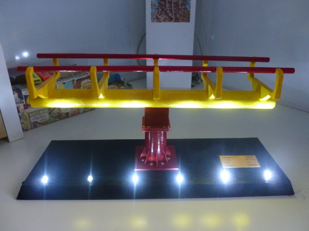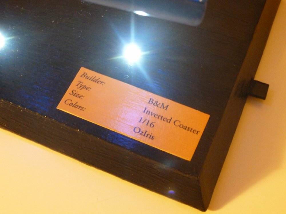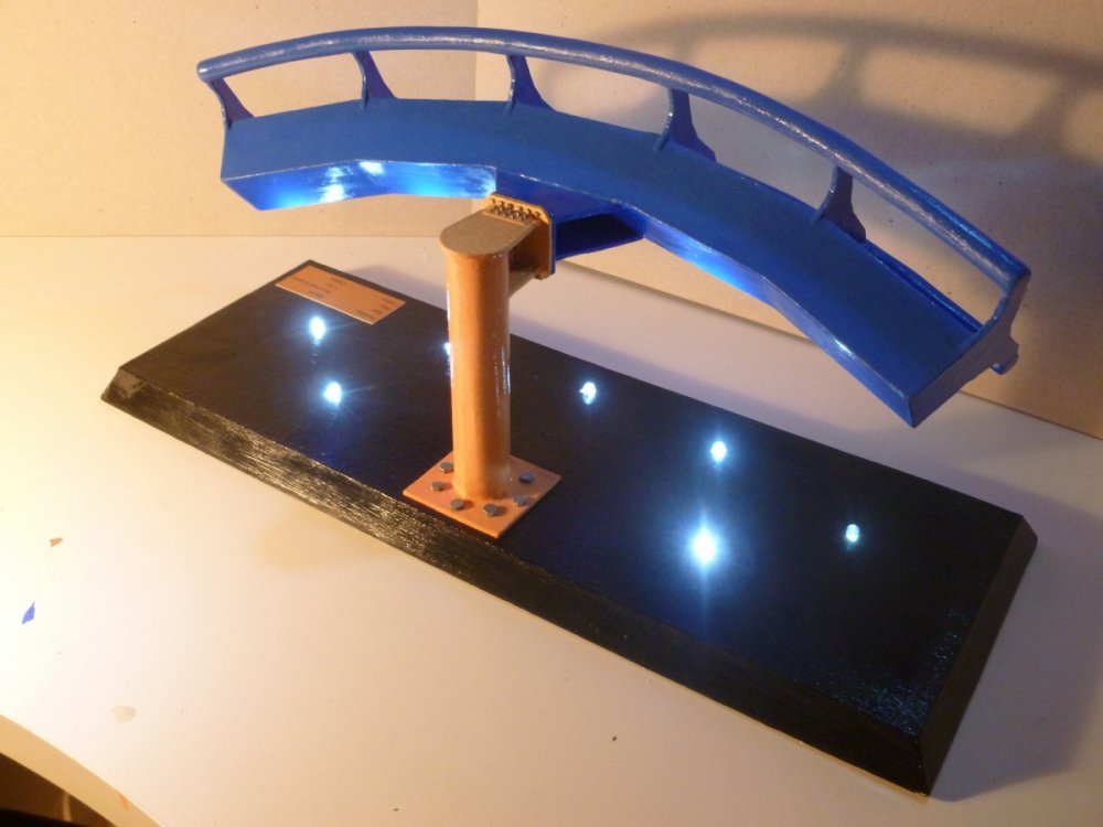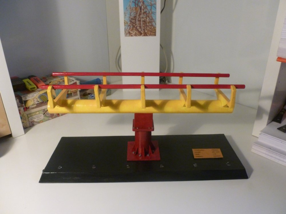 7. Hi everyone ! As you can see, the results is not perfect, this Immelmann is not very smooth and worse: it's too short and to dangerous to be realistic, but I think it's a good start to future complex models. Caracteristics - size: 1/50 (40 cm) - track type: B&M sit down coaster - colors: Banshee coaster - lighting: white LEDs powered by baterries (2x1,5 V). I'm waiting for your comments I tried to respect the design of the main spine B&M rails... I like the shadow !