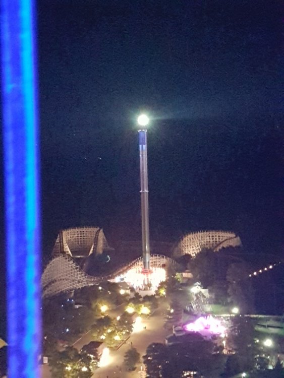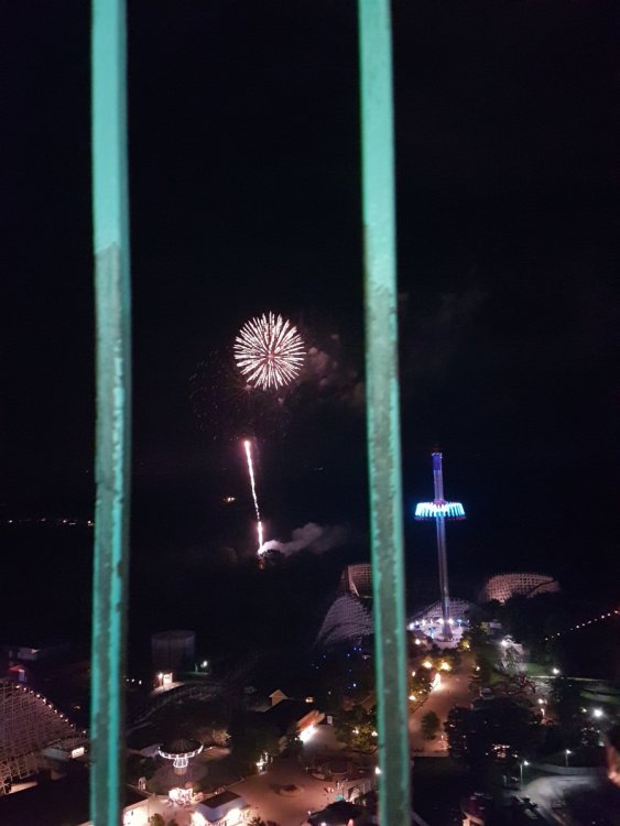 Well my friends and I went to Kings Island but didn't get there until 1:30-2pm. We spent the majority of our time in the waterpark since it was hot and sunny. We ended up doing both wave pools, the family raft ride, sand volleyball court and the lazy river, which we did 6 laps. One thing though, the waterslide with the whole family is a bit rough of a landing when you bounce in the air. I'll take Holiday World's version 10x over Kings Island's. The tornado waterslide we didn't ride cause I've done it quite a bit at Splashin Safari. Then it was to the dry park. Only coasters we got on was The Beast and Flight of Fear. The Beast at 7pm was a 5 minute wait. I rode in the middle as I can't do front row. It was rough and my friend and I got bruises on our arms. Flight of Fear said it was a 45 minute wait according to the app but felt shorter. My friends loved it but me, not so much. First time riding it but don't think i'll be riding it. We went back to the Beast to get a night ride on it but we didn't want to wait until after 10 cause we wanted to see the fireworks from the top of the Eiffel Tower, which was an incredible view! We also rode Shake, Rattle and Roll, which was fun, bumper cars, swings, scrambler. We wanted to ride Windseeker (but it got stuck at the end of the night), Drop Tower (which was stuck when we got there), Delierium (app said closed so we didn't go up that way). The app even said Banshee was closed for awhile so no idea what was going on there. We are thinking of going to Haunt so hopefully we can finish those. After the water park closed the dry park was so packed. We didn't even get a ride on Mystic Timbers cause at one point the line was in the midway and we was walking back to the water park to get stuff out of our lockers. Some security lady at the railroad tracks was rude and said we were to take it before 7. I talked to the security guy by the lockers and told him the ordeal (security told us earlier we could do this). He said oh i'm her boss, I'll talk to her. So pretty lit up at night! So high up there but oh the view! Best firework photo I got -