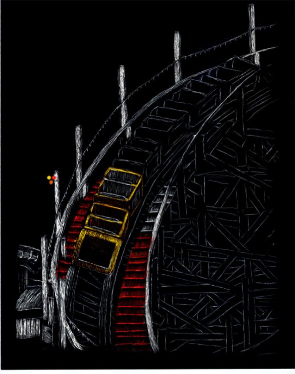 7. Ok, I know this technically could be in the TPR Art forum but I think as well as you may think that this deserves it's own topic. First off, I'm assuming you know what Scratchboard is. For those who don't, it is simply a peice of paper coated with a thin layer of clay stuff, and coated with black India Ink. The artist takes an Xacto Knife and scratches the black off, showing the white layer underneath. So yesterday, I started a new scratchboard project for my advanced art class. And being a coaster fanatic as I am, I obviously take upon the challenge of a coaster. Many of you have seen my stippled B&M coaster, Mantis which looked quite difficult but the one I chose to do is much more difficult (yet less painful to the hand.) I'll let the WIP tell you the rest. I will keep you updated as I progress within the next week on it and add color to it. Lastly, I can't end this topic without you guys having to guess what the coaster is, so go on...take a guess!