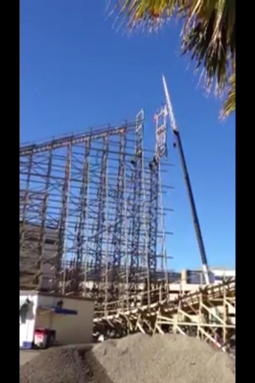 Is that an archway/'do not stand up' sign? Or is that just the top of a bent? It's hard to tell from the just about straight on profile. It also made me wonder...is the drop going to be covered? Anyway, it looks like it's just about ready to peak, just a few more bents to go! Also looks like that bottom of the drop is just beginning to swoop upwards!