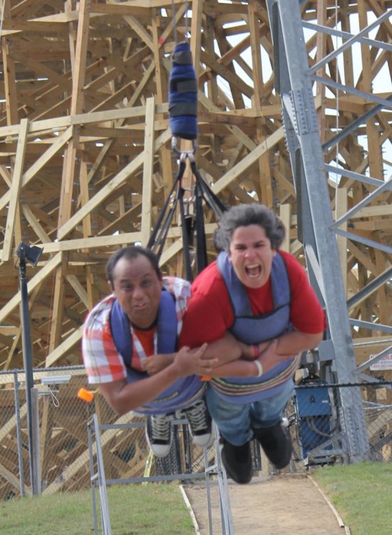 ^Gotta love college classes Gives me time to look forward for the next trip report rather than cramming them all into 1 basket. Oh, I totally forgot to add these to my trip report, close up photos from the initial swing on Xtreme. Priceless shot #1 of my cousin and Jeff Priceless shot #2 of Blue Fire Guy and I just milliseconds after pulling the cord.