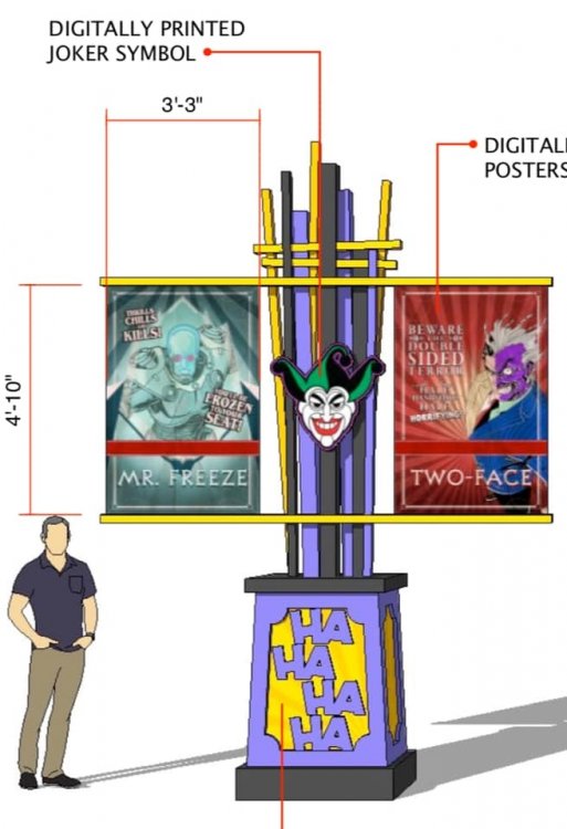 Some new concept art for "Joker: Carnival of Chaos" was released today in the Texas Thrill Seekers Facebook group by the one, the only, Jeffrey Siebert. Also released was the all new DC Super-Villian Swing concept art (formerly Whirligig I believe) **ALL CREDIT FOR THESE PHOTOS GO TO JEFFREY SIEBERT** The following are illustrations for the ride panels DC Super-Villian Swing concept art Ride Entrance Concept Art Ride Entrance Concept Art New sign banners and holders? Below are the new banners Revamped Superman (Entrance?) and Gift store Revamped Superman Game Area booths