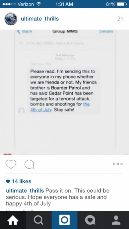 Someone on Instagram says that Cedar Point is going to be attacked on the 4th of July. While I know this obviously fake to you and me, people are actually believing this guy... -