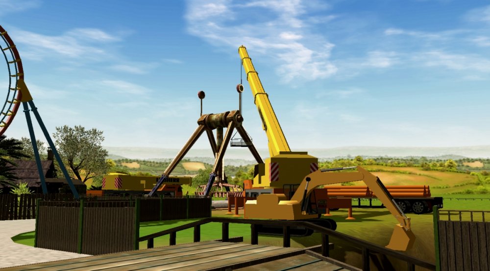 During these past two and a half months, Verona Resort has made a lot of progress! A large part of that being the construction of a new flat ride! First, there was a new building that was constructed, and it is located right next to the entrance to the Call of the Wild. It has a very dark, Caribbean theme to it, and it houses a restroom. I think that the building looks really cool! We started seeing some construction start with the land just across from the coaster. Some construction workers took a few pictures of the construction site, but with in a few weeks, the attraction was in place. Within a few more weeks, the ride was almost ready for opening day, just a few minor touches left to do! The ride is a suspended swinging, and rotating disk ride which swings guests up to about 40ish feet at about 30 mph. All doing that while spinning! No name has been released for the ride. The new restroom building. Another view. You can see a construction truck leveling out the ground and prepping the area for construction. Taken from a construction worker, you can see the overview of the site for the new attraction. Standing next to the underground tunnel entrance/exit, you can see the crane constructing the new attraction. You can see the ride from the bridge. A few weeks later, the ride was testing and queue was done with most of the foliage complete. Just a few more extra things to put in! -