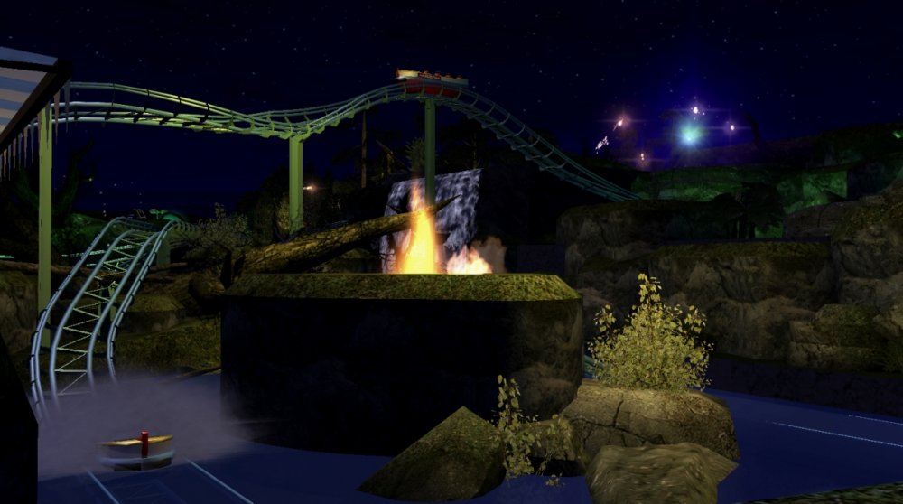 Andrew Gatsby has released some new images of his park and they look pretty good! It looks like we get another look at the monorail, as well as three coasters! They look very very thrilling and I hope to ride them soon! Gatsby says that when the park opens, his goal is to get his money back by the end of the first year of the park operation. He has not said weather the park will be open year round, or if it will only operate certain times a year. Gatsby has not released any information on food/drinks. The back side of the monorail station. There seems to be a small pier over looking a lake with fountains. Lots of fire. Also we can see a coaster! It looks to be a corkscrew type. We can also a bumper car ride through the trees! 'The storm will never be tame'-Gatsby. This looks to be the station for a dueling coaster!