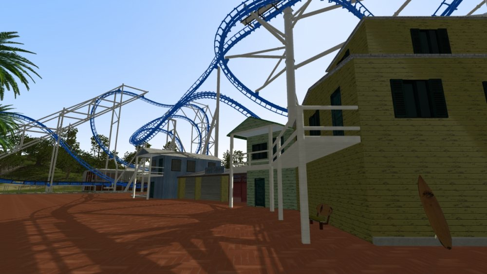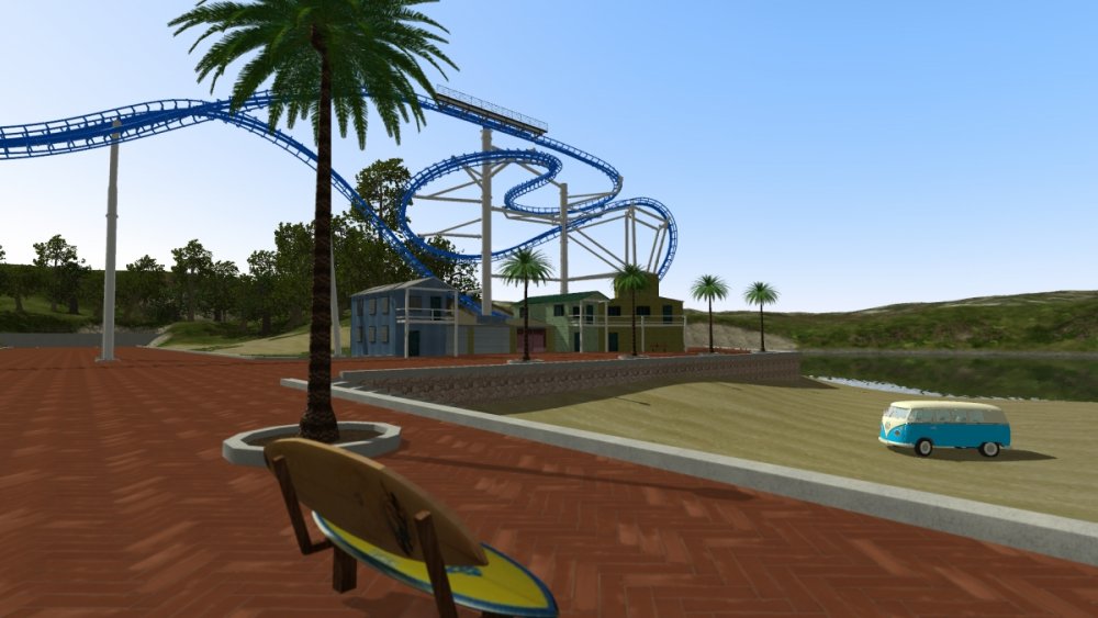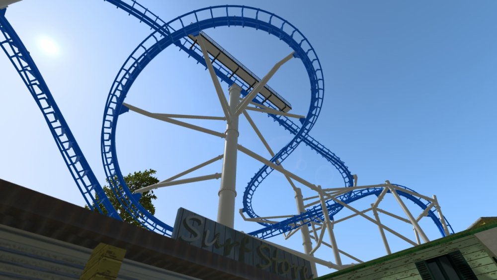 When I started building this coaster, I had a Vekoma Stingray in mind. Long story short: it doesn't look like a Stingray at all. But I still think this coaster has a great layout. Theming-wise I've gone for a SurfRock feel. The chosen name is Bombora: an Australian term for a large wave created by a shallow area, which I thought would fit a relatively big coaster in a small footprint. Here are some pics: