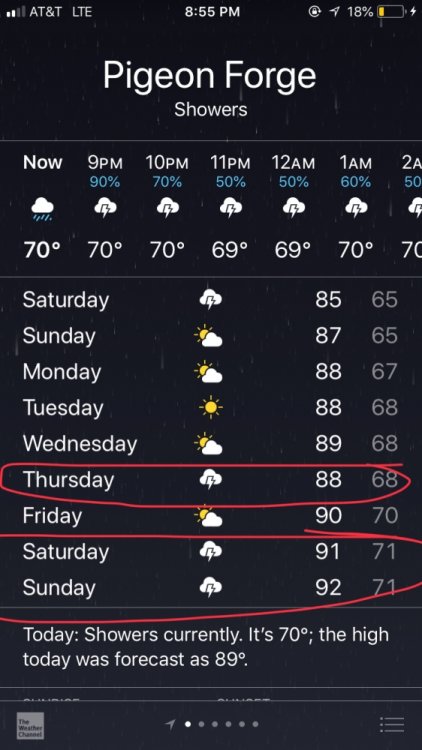 The forecast in the smokies can honestly change by the hour. More so in the summer time than the fall. For example it can say “Sunny and 90’s” all week long. The day of your trip the forecast changes to rain all week. Then once you get there only a couple days of rain with small chances. We usually go to the park and play it by the hour. Meaning if it’s a quick weekend trip down we’ll go down Friday evening, watch the forecast all night. If rain is in the forecast and includes lightning (and doesn’t change) we’ll change to Sunday if it looks better. So regarding thanksgiving your main concern will be rain, snow possibilities, and cold temps. I’d honestly just watch it every single day because it’ll change. Look at a 14 day forecast as well. Another example is below. Those days I have circled will more than likely change. I don’t look for tomorrow to change so I wouldn’t go tomorrow if I was anyone. It’ll be a wet, stormy day. -